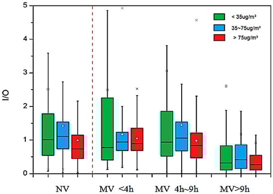 In their study, Zhao and Liu (2020) [42] combined surveys with measurements of ventilation performance and indoor air quality to examine apartment ventilation behaviours and air quality outcomes. Data were collected over the course of one year from 36 apartments located in five Chinese cities representing three distinct climate zones. On average, apartments were exposed to outdoor air for approximately 9.1 h per day. Approximately 11.1% of occupants operated mechanical ventilation systems nearly continuously throughout the day, while most residents adjusted temperature settings only when necessary. During winter months, increased outdoor PM2.5 concentrations led to longer durations of fan operation. Most mechanical ventilation systems operated at approximately 50% efficiency. The average ACH was measured at 0.56, significantly below the expected standard. Interestingly, the 9 h average ventilation duration closely aligns with the typical runtime of mechanical ventilation equipment in many Chinese households. Figure 10 illustrates the relationship between indoor-to-outdoor (I/O) particulate matter ratios and the use of natural and mechanical ventilation under variable outdoor PM2.5 concentrations. Specifically, Figure 10 presents the results of different ventilation techniques including (NV, MV < 4 h, MV 4–9 h, and MV > 9 h) in terms of indoor-to-outdoor (I/O) ratios for different dust concentration categories. The box plots signify that natural ventilation (NV) consistently attains the greatest I/O ratios across all dust categories, mainly for concentrations under 35 µg/m3. On the other hand, the mechanical ventilation (MV) techniques display variable efficiencies, with MV < 4 h acting better than MV 4–9 h and MV > 9 h for lower dust levels. More importantly, as dust concentrations rise, the I/O ratios reduce for all MV techniques, signifying that longer exposure times can be less active in preserving low indoor dust levels in comparison to natural ventilation.