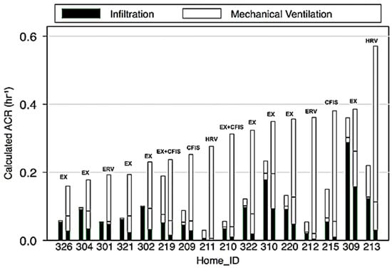 Sixteen two-week residences with and without WHMV systems had their air change rates computed and arranged by ACR with WHMV [45].