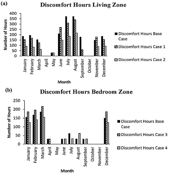 The study by Yassine et al. (2012) [51] investigates building design strategies aimed at reducing energy usage for thermal comfort in residential dwellings. The proposed model incorporates a proportional–integral–derivative (PID) controller and numerical simulations to predict indoor air temperature regulated through mechanical ventilation. The building design is adapted to the climate of Beirut, Lebanon, which is moderated by proximity to the sea and is generally temperate. Several ventilation and wall insulation configurations were tested in both the living and bedroom zones of an apartment. Simulation results indicate that the optimal wall configuration for the living area consists of a 5 cm layer of insulating strawboard sandwiched between two 2 cm masonry layers made of Hempcrete. For the bedroom, the most effective configuration was a single 10 cm-thick Hempcrete wall. Referring to Figure 14a, which focuses on the living area, three base scenarios and two additional cases are demonstrated while presenting the number of discomfort hours in the living area across different months. The discomfort hours peak in the summer months (especially July), showing substantial discomfort throughout warmer periods. Case 2 mostly depicts lesser discomfort hours in a comparison to the base case, proposing that specific interventions can lessen discomfort. Furthermore, Figure 14b represents the sleeping area, where the discomfort hours are particularly reduced, with negligible fluctuations during the year. Also, the base case depicts some discomfort in the warmer months, but cases 3 and 4 display a dependable decrease in discomfort hours. This indicates that the sleeping area experiences less discomfort. This is due to more active temperature control or ventilation strategies.