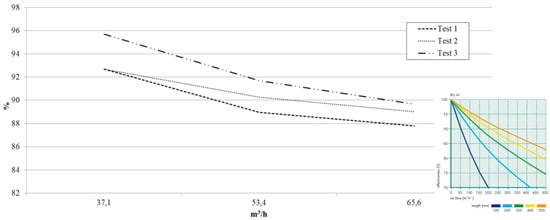 Asdrubali et al. (2015) [52] established a new experimental facility at the Thermal Engineering Laboratory of the University of Perugia to evaluate the performance of heat recovery devices used in air handling systems. Initially, the research team tested a commercial plate heat exchanger using polystyrene as the core material. Although polystyrene has low thermal conductivity, its flexibility allows for the design of thinner exchangers, enabling improved thermal efficiency despite challenges related to weight and cost. The researchers recorded flow rates, pressure drops, and all relevant temperature values associated with the heat exchanger. A series of experiments was conducted with varying temperature conditions, outdoor environments, and airflow rates to determine the unit’s energy efficiency index. As shown in Figure 15, the impact of fan speed (i.e., mass flow rate) on the performance across three test conditions is illustrated. Figure 15 specifically depicts the system’s efficacy across various mass flow rates (37.1, 53.4, and 65.6 m3/h) as demonstrated by three efficiency trends (Text 1, Text 2, and Text 3). Clearly, the system demonstrated an average efficiency exceeding 90%, with further improvement observed when the water circulation pump operated at a reduced flow rate. However, as mass flow rates rise, a minor drop in efficacy is detected across all three trends. Figure 15 also delivers further details, indicating that while efficiency remains relatively stable, the rate of drop differs among the different texts. This suggests that optimisation of mass flow rates is critical to maintain the system performance while balancing efficiency.