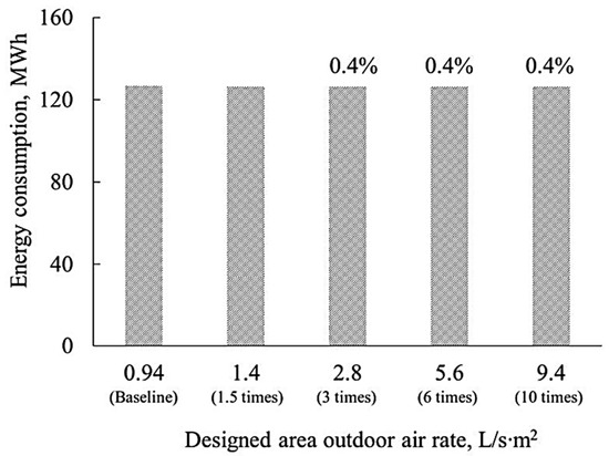 Sha and Qi (2020) [57] examined the application of mechanical ventilation for ventilated cooling in high-rise buildings and its potential for energy savings (Figure 16). Energy models were developed for various components of the cooling system. Several energy-saving strategies were proposed based on model analysis, including the adoption of optimal control methods, the use of energy-efficient fans, and increasing the nominal operating speed of ventilation fans. An institutional high-rise building was used as a case study to test the proposed strategies. The results showed that improvements in fan efficiency, optimised control strategies, and increased nominal ventilation flow rates can substantially reduce cooling energy usage. However, further optimisation of room ventilation rates alone was found to have a minimal impact on energy savings. Figure 17 depicts the change in the energy consumption (in MWh) against variable nominal ventilation flow rates, in addition to contrasting scenarios with and without effective fans. The baseline scenario depicts a steady energy consumption level across all tested air rates (0.94, 1.4, 2.8, 5.6, and 10 L/s·m2). Remarkably, the energy savings are minimal, with only minor decreases detected at higher ventilation rates (specified by 0.4% savings). This proposes that while raising the outdoor air rate can cause better ventilation, the effect on energy consumption is incomplete, signifying that efficient fan systems cannot considerably change energy use in these scenarios. In other words, additional energy input would be required to improve mechanical ventilation efficiency in cases where low-efficiency fans are employed.