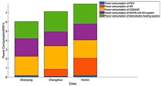 Guan et al. (2023) [62] presented a novel collector–storage solar air heating system (CSSAHS) featuring a thermal storage unit (TSU) with a dual S-channel heat exchanger. A model of the integrated system was developed, and field testing was conducted in a selected city in China. The system included a solar air collector, heat recovery device, fan, and TSU. The study found that the temperature of incoming fresh air had the greatest influence on gas release and storage processes. Heat release efficiency increased by approximately 1.58% when the fresh air temperature ranged between –6 °C and 18 °C. Simulation analyses under various conditions were used to optimise the collector area and TSU sizing for cold-climate cities. The CSSAHS system was able to preheat fresh air for up to 5 h after storage and utilized 52% to 74% of the stored heat. A comparison of power consumption between the CSSAHS and conventional electric heating systems is presented in Figure 18. Specifically, Figure 18 contrasts the power consumption (in kWh) of the CSSAHS system against several other systems across three cities: Shenyang, Changchun, and Harbin. Each bar demonstrates the total power consumption segmented into components: the power consumption of FEH, AH, CSSAHS, the MWHR with EH system, and the total electric heating system. Specifically, the CSSAHS system depicts a discrete portion of the total power consumption in all considered cities, highlighting its efficacy in a comparison to the other systems. Clearly, power consumption is highest in Harbin, representing higher energy demands in colder climates. The data demonstrate that while CSSAHS contributes to overall power usage, it is generally more effectual than some other conventional systems, especially in extremely cold conditions. Statistically, it can be stated that the daily electricity use for electric heating is recorded as 6.05 kWh in Shenyang, 7.14 kWh in Changchun, and 7.97 kWh in Harbin.