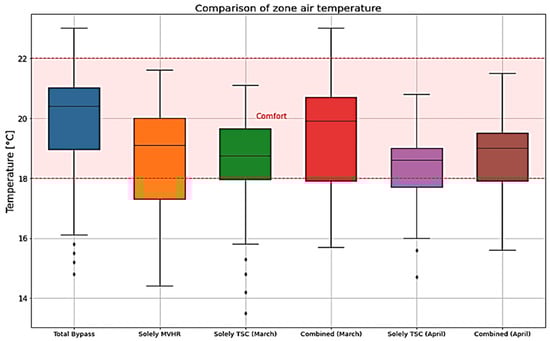 Moghadam et al. (2025) [64] analysed a system integrating transpired solar collectors (TSC) with an MVHR unit to preheat ventilation air in a university classroom in Cork, Ireland. The study also assessed the system’s ability to maintain acceptable IAQ while achieving energy savings. Experimental monitoring of the integrated TSC-MVHR system was carried out during spring 2024. The analysis considered wind speed, airflow rate, temperature rise, and solar radiation in evaluating the TSC’s thermal performance, with results compared to findings from previous literature. The CO2 concentration, outdoor air temperature, and energy usage of the MVHR system were evaluated across various operational scenarios. The findings suggest that wind speed, mass flow rate, and air temperature rise are key variables influencing the thermal performance of the TSC. However, increased energy use by the TSC fan was found to reduce the heating efficiency of the MVHR system. Figure 19 depicts a contrast of zone air temperatures (in °C) for various HVAC designs: total bypass, solely MVHR, solely TSC (March), combined (March), solely TSC (April), and combined (April). Each box plot represents the temperature distribution, with the red shaded area signifying the comfort range of (18–22 °C). Specifically, the total bypass design depicts the highest median temperature, while the solely TSC (March) and combined (April) designs present the lowest median temperatures. The temperature ranges vary meaningfully across designs, with some demonstrating wider interquartile ranges, proposing variations in comfort levels. The data specifies that designs using total bypass and combined systems are more effective at preserving temperatures within the comfort zone in comparison to the others, chiefly during cooler months.