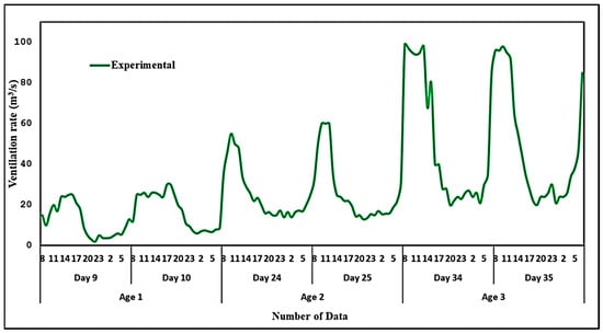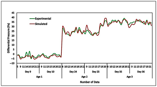 Elghardouf et al. (2023) [72] developed a model to assess air pressure and velocity variations within a broiler house operating under mechanical ventilation in a Mediterranean summer climate. Experimental data, including air temperature, humidity, airspeed, and differential pressure, were collected, and simulations were performed to validate the model. The study considered natural, power, and tunnel ventilation modes. Pressure differentials at the exhaust ranged from −5 to 39 Pa, while airflow speeds varied from 0.09 to 1.641 m/s across all modes. Figure 20 contrasted simulated differential pressure (in Pascals) against experimentally measured values over a series of data points (Days 9 to 36). The brown line signifies simulated results, while the green line signifies experimental data. Clearly, the two sets of data display a close relationship, particularly in the stable ranges. However, inconsistencies are distinguished on specific days, such as Day 10 and shortly after Day 24, where the simulated values deviate from experimental measurements. These variations propose that while the simulation model generally line up well with experimental results, further refinement might be important to improve accuracy during transitional periods. Statistically, under maximum ventilation conditions, positive pressure reached 39 and 37.98 Pa in simulations and 34.37 and 34.9 Pa in observed measurements (Figure 20). Figure 21 depicts the monitored ventilation rates (in m3/s) against the rearing period, with data collected on specific days (Days 9 to 36). The green line demonstrates the ventilation rates throughout the experiment. Specifically, there are notable variations in ventilation rates, with peaks detected on several days, principally around Days 10, 24, and 25. These peaks indicate periods of growing ventilation, probably in answer to environmental conditions or animal activity. The data specify variations in ventilation needs consistent with various ages (marked as Age 1, Age 2, and Age 3), emphasising the dynamic nature of ventilation requirements across the rearing period. The findings confirm the role of strong suction pressure in drawing in fresh air through inlets and expelling warm, moist, and stale air, as illustrated in Figure 21.