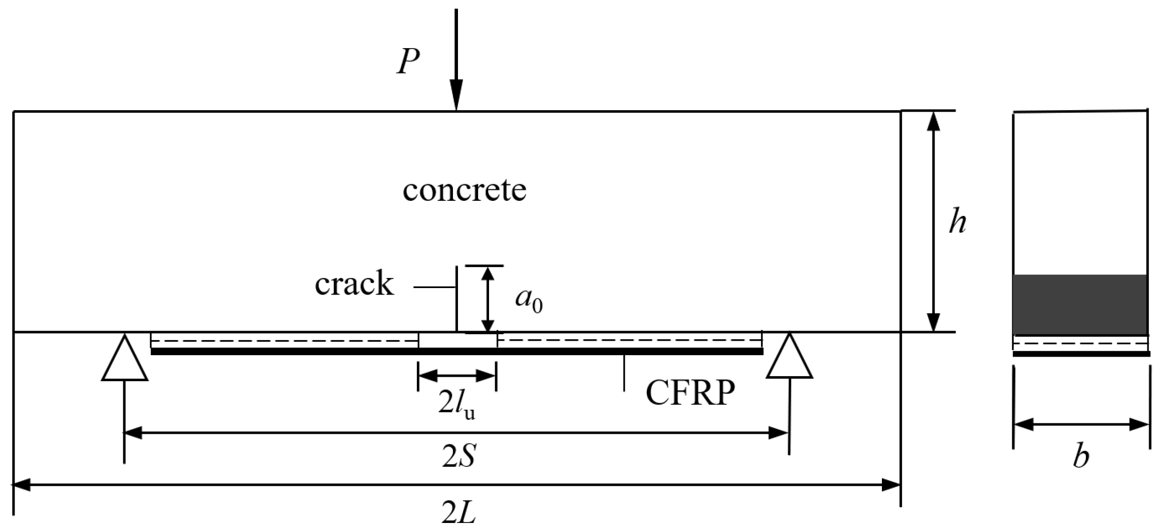 - Shang, W.; Ning, X.B.; Liu, J.H.; Liu, J. Failure analysis and evaluation for cracked concrete beam reinforced with CFRP. Theor. Appl. Fract. Mech. 2024, 129, 104222. [Google Scholar] [CrossRef]