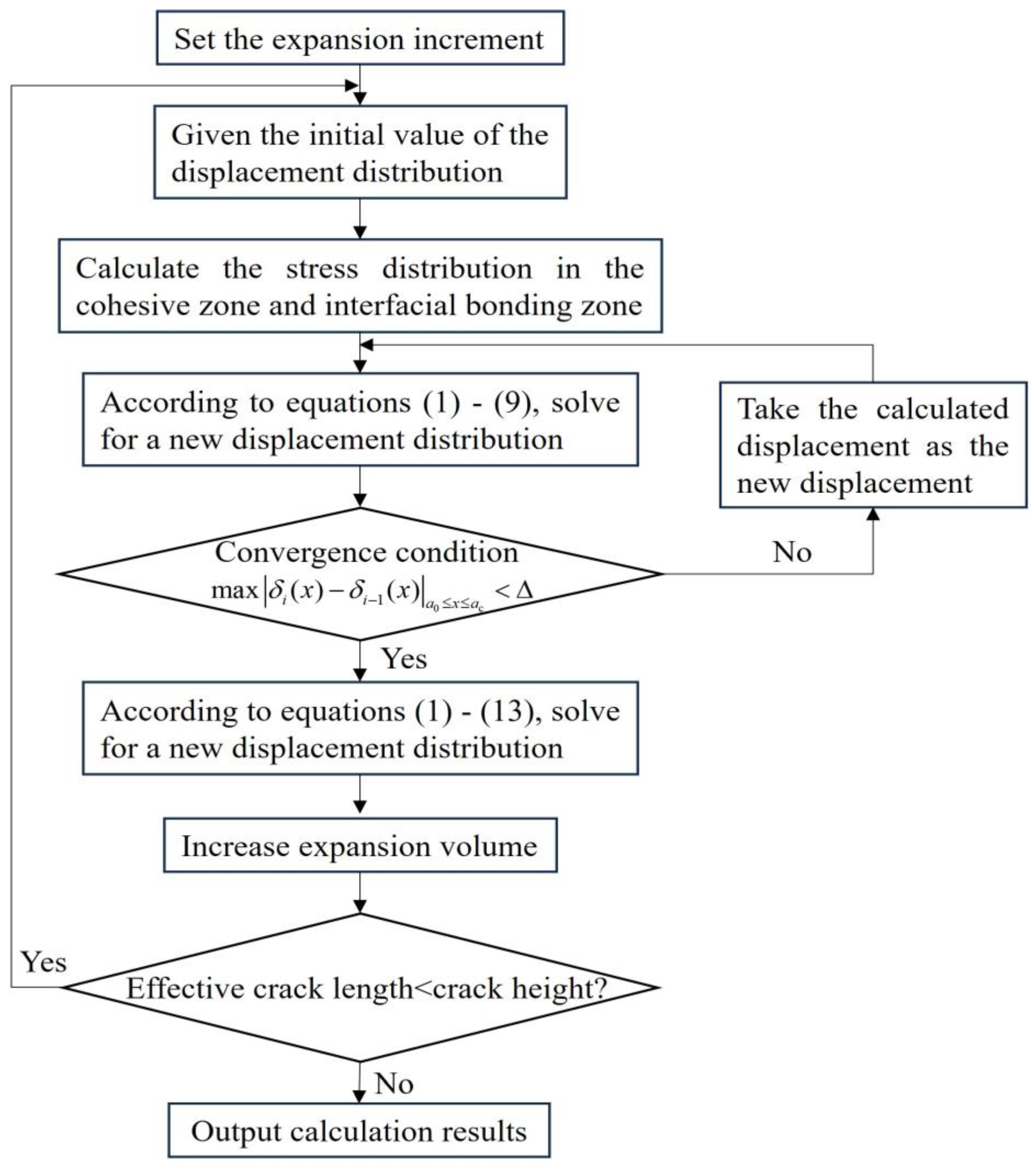 - Substitute the external load P, cohesive force, and shear stress into Equations (2)–(9), respectively, to solve for the new displacement distribution.