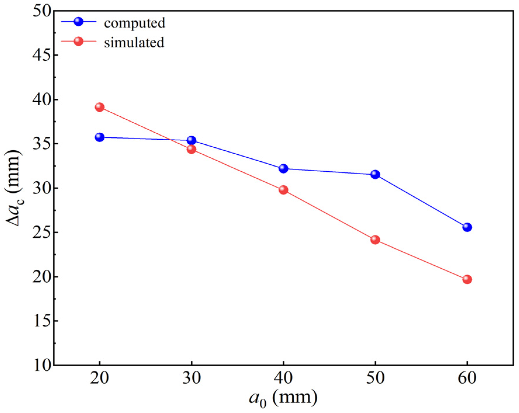 - The numerical results of the critical effective crack extension length of CFRP concrete beams under static loading decrease linearly with an increase in the initial crack length, which is consistent with the variation law of the test results. When the initial crack length is 30 mm, the numerical results are in good agreement with the test results, indicating that the numerical simulation method in this paper can serve the purpose of accurate prediction for structures with short initial crack lengths.