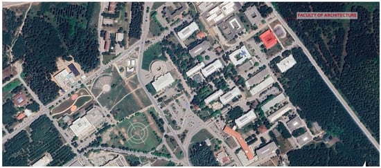Aerial photograph of the BUÜ campus area, highlighting the case study building [52].