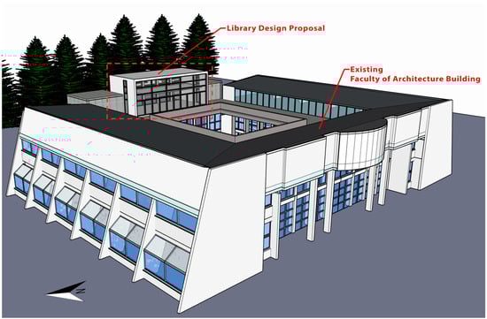 The new library addition will be integrated into the existing Bursa Uludag University (BUÜ) Faculty of Architecture building in northwestern Turkiye. The original skillion roof has been replaced with a terrace, providing additional outdoor space and expanding classroom capacity. The library will occupy the northern end of the flat roof, with its envelope designed to harmonize with the architectural features of the existing building. Design considerations include window proportions and the northeast façade’s concrete columns, which serve as structural shading elements. An aerial photograph of the campus area and a 3D perspective of the proposed library are presented in Figure 2 and Figure 3, respectively.