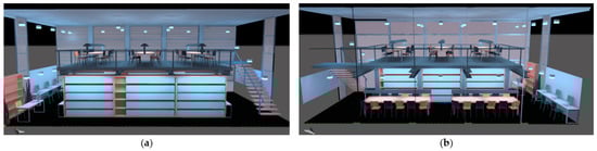 DIALux Evo 3D model visuals of the library from (a) the southwest façade; (b) northeast façade.