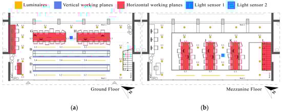 Overlay of architectural and lighting plans for (a) the ground floor; (b) the mezzanine floor.