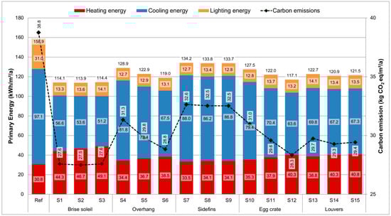 For primary energy and operational carbon emissions, values peak in side fins scenarios (e.g., 134.2 kWh/m2/a and 32.6 kg CO2 eq/m2/a for S7) and reach the lowest levels in brise soleil configurations, indicating superior performance. Among the evaluated alternatives, the fixed brise soleil design (S2)—with a slat angle of 30° and a depth of 0.4 m—emerges as the most energy-efficient.