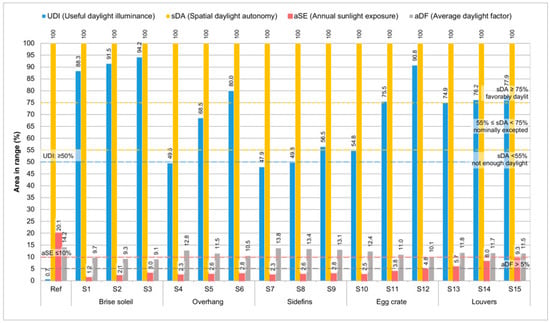 The base case’s high aSE1000/250h<10% (20.1%) underscored risks of glare and overheating—issues effectively mitigated by all shading alternatives (aSE < 10%). Overall, brise soleil configurations emerged as the most advantageous solar shading strategies, balancing daylight adequacy (sDA) with visual comfort (UDI, aSE).