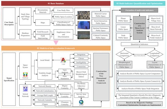Building upon these identified research gaps, the present study establishes an integrated quantitative analysis framework for examining spatial morphological patterns in heritage villages, as systematically outlined in Figure 1. This analytical framework comprises three fundamental components.