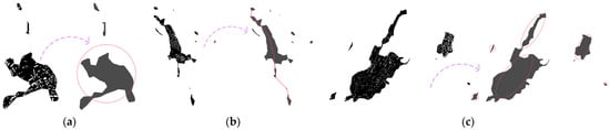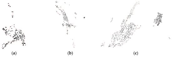 Given these distinctive characteristics, this study adopts Jiang et al.’s methodology (illustrated in Figure 3), generating settlement boundary polygons using 100 m virtual buffer zones to classify boundary morphologies of northern Xinjiang’s nomadic heritage villages [62]. The results reveal three predominant morphological types: compact, linear, and dispersed (Figure 4).