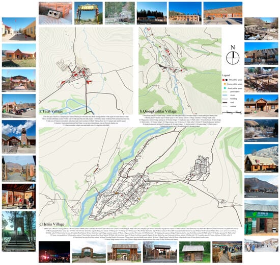 Field investigations revealed that Hemu and Talat Villages have largely modernized road systems, whereas Qiongkusitai Village maintains predominantly unpaved roads. Notably, Talat Village contains numerous cul-de-sacs that ensure residential privacy but result in fragmented connectivity and an incomplete street network. The master plans of the three villages and photographs of their typical public spaces are shown in Figure 6.