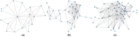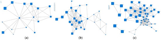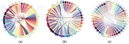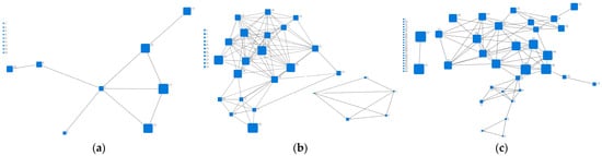 Visualization network of weighted proportions in spatial domain network models. (a) Visualization network of weighted proportions in the spatial domain network model of Talat; (b) visualization network of weighted proportions in the spatial domain network model of Qiongkushitai; (c) visualization network of weighted proportions in the spatial domain network model of Hemu.