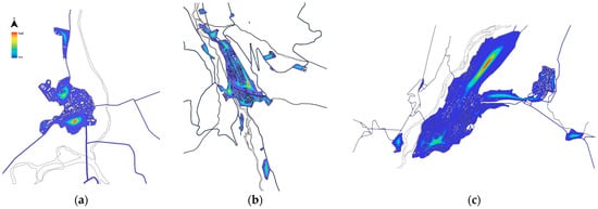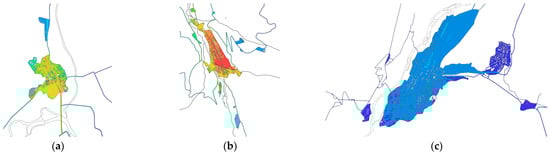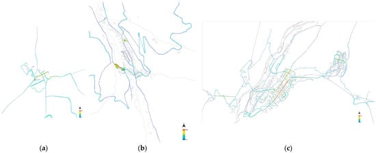 The study begins by employing CAD technology to convert the three villages into recognizable graphics in Depthmap+ Beta 1.0 (v2012). These graphics are then imported into Depthmap+ to construct an axial model (Figure 7), which facilitates the analysis of the villages’ street-scale and linear spatial characteristics. This model also serves as the foundation for quantifying the villages’ intelligibility and axial connectivity values. Additionally, in Section 2.1.1, the research integrates the villages’ visual boundaries (Figure 3) with their road networks to define the scope for visual analysis [63].
