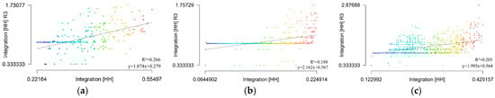 The research applies space syntax analysis using intelligibility and visual integration metrics to quantitatively examine the axial model constructed in Section 2.2.1 and the visibility boundaries of village territories. This analytical method diagnoses the overall visibility characteristics of different village types (Figure 9) and examines the correlation between the part and whole of the village (Figure 10). The results reveal macro-scale structural features of the villages.