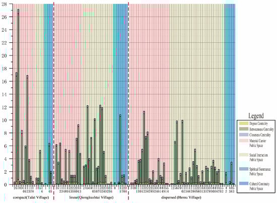 Network density serves as a metric for evaluating the completeness of nodal connections within villages, primarily reflecting the compactness of their current spatial layouts. This research utilizes network density and centralization metrics from social network analysis to assess public space layout compactness (Table 5). The comparative analysis yields three key findings: First, Hemu Village’s dispersed structure achieves optimal public space network density. Second, Talat Village’s compact block pattern demonstrates intermediate density performance. Third, Qiongkushitai Village’s linear configuration results in the lowest density values. Notably, compact villages exhibit superior network centrality characterized by three distinct advantages: balanced spatial distribution, pronounced central tendency, and well-defined core areas—all significantly outperforming linear and dispersed settlement types.