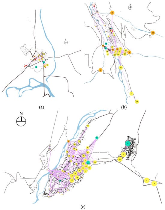 Each existing public space within the villages was treated as a node. A direct, unobstructed path between two nodes—without intervening nodes or alternative paths—was defined as an edge and assigned a value of 1; otherwise, the value is 0 [64]. A street network dataset was constructed in GIS, and service area analysis layers were created. As this step primarily served as an intermediate phase for modeling village spatial domains, only Talat Village—characterized by fewer nodes—was selected for detailed analysis, while other villages were omitted for brevity. Given the small scale of the target villages, edge distances were set within a walkable range (70–120 m), with a 1 min walking distance (120 m) established as the threshold for determining node connectivity. Accessible areas are represented by shaded regions and red road lines in Figure A1 of Appendix A, where nodes within these ranges were considered interconnected. The binary adjacency matrices of the three villages (Figure A3 of Appendix A) were processed in UCINET 6.0, and the computational results were visualized using NETDRAW (v2.1) to construct a topological network model of spatial domains for nomadic tourism-oriented heritage villages in Northern Xinjiang (Figure 8).