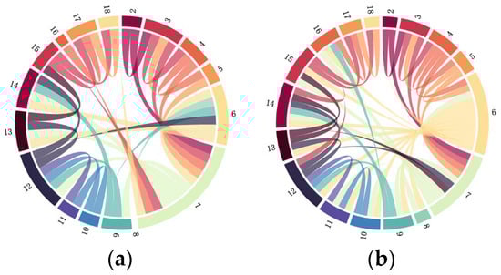 The public space network model of Hemu Village contains 40 cliques, which are numerous and scattered. Nodes 1, 2, 14, 53, and 54 did not form any cliques, consistent with the characteristics of a dispersed village. The public space network model of Hemu Village consists of 40 spatially distributed clusters. Nodes 1, 2, 14, 53, and 54 remain unclustered, exhibiting relatively even weighted distributions that align with the village’s dispersed settlement pattern. This spatial configuration reflects two characteristic behaviors: residents demonstrate purpose-driven mobility with minimal cross-regional commuting, while tourists primarily rely on shuttle services to access distributed public spaces despite their spatial separation.