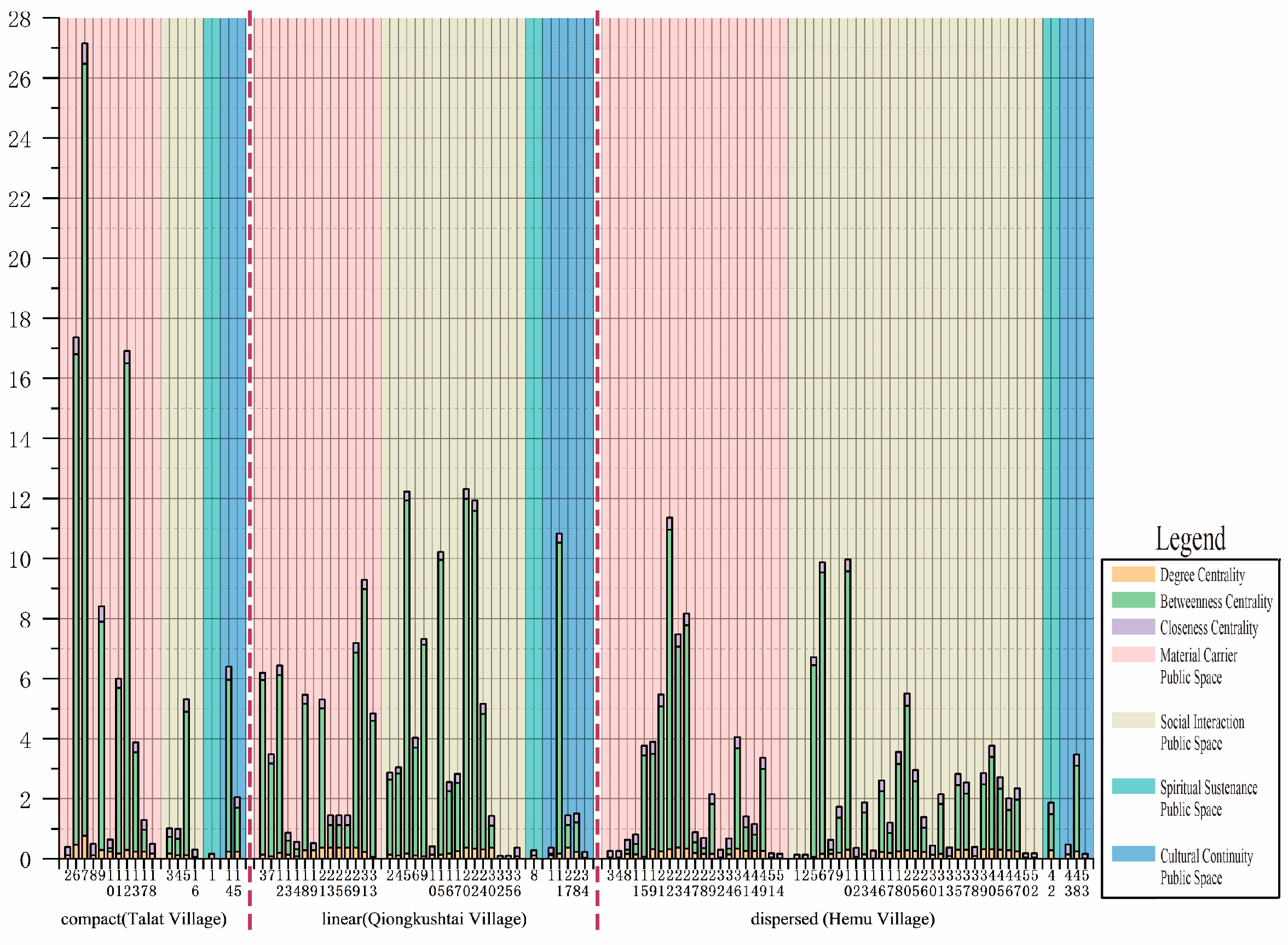 - Linear villages maintain good visibility with linearly distributed core nodes and optimal average shortest path but display the poorest spatial cohesion and system connectivity of public spaces.