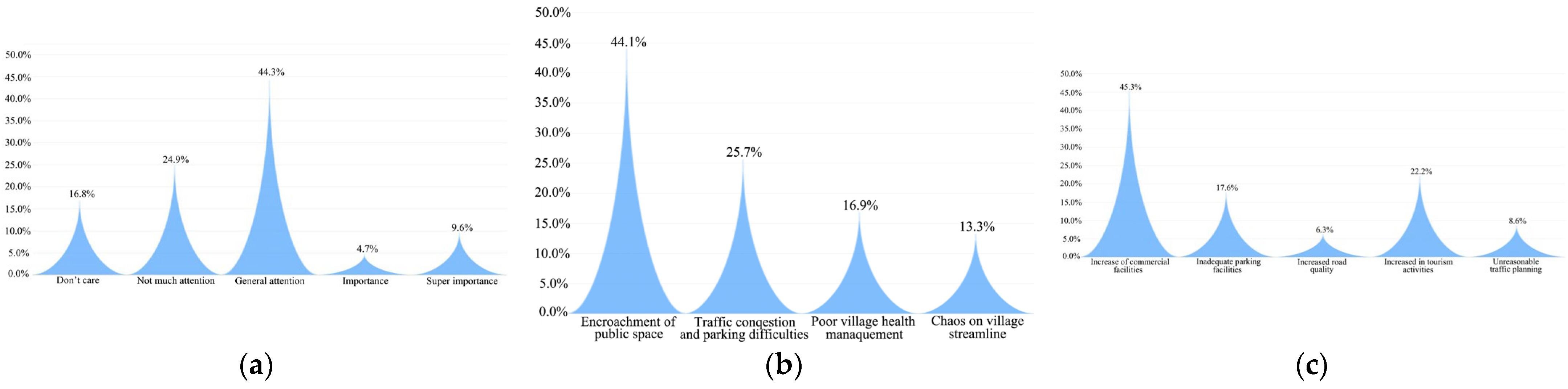 - Limitations of space syntax: The visibility graph analysis obtained through Depthmap+ has several limitations. This software’s analysis is based on human eye-level perspective and cannot accurately represent terrain elevation differences or building heights. For destinations with distinct seasonal variations, the visibility analysis remains unchanged over time. The results present an idealized scenario that only accounts for fixed obstacles in the village, excluding dynamic factors like crowd obstruction. These aspects represent inherent limitations of space syntax analysis.