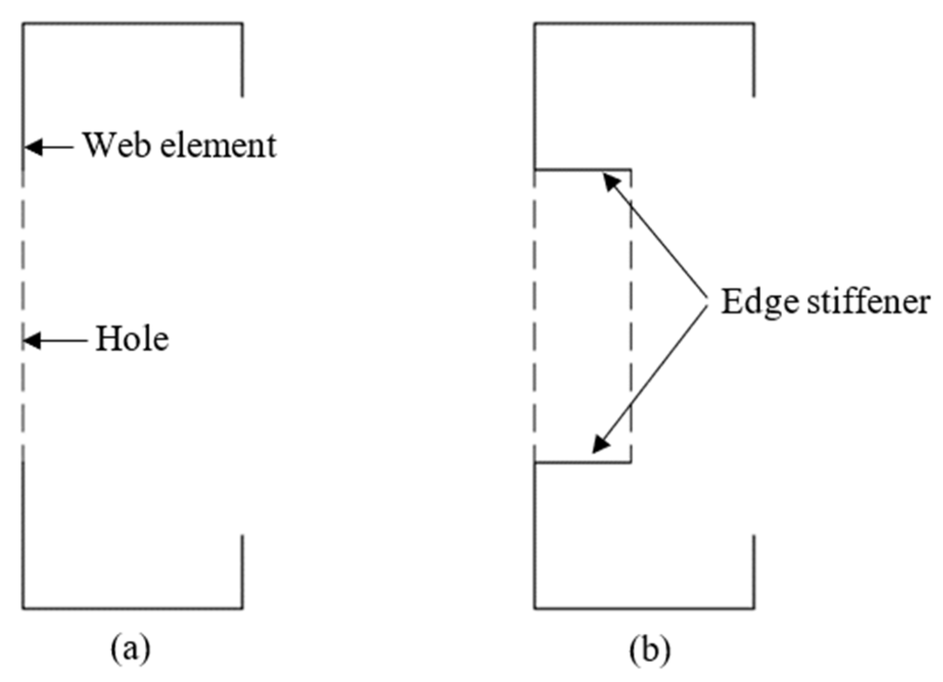 - Yu, C. Cold-formed steel flexural member with edge stiffened holes: Behaviour, optimization, and design. J. Constr. Steel Res. 2012, 71, 210–218. [Google Scholar] [CrossRef]