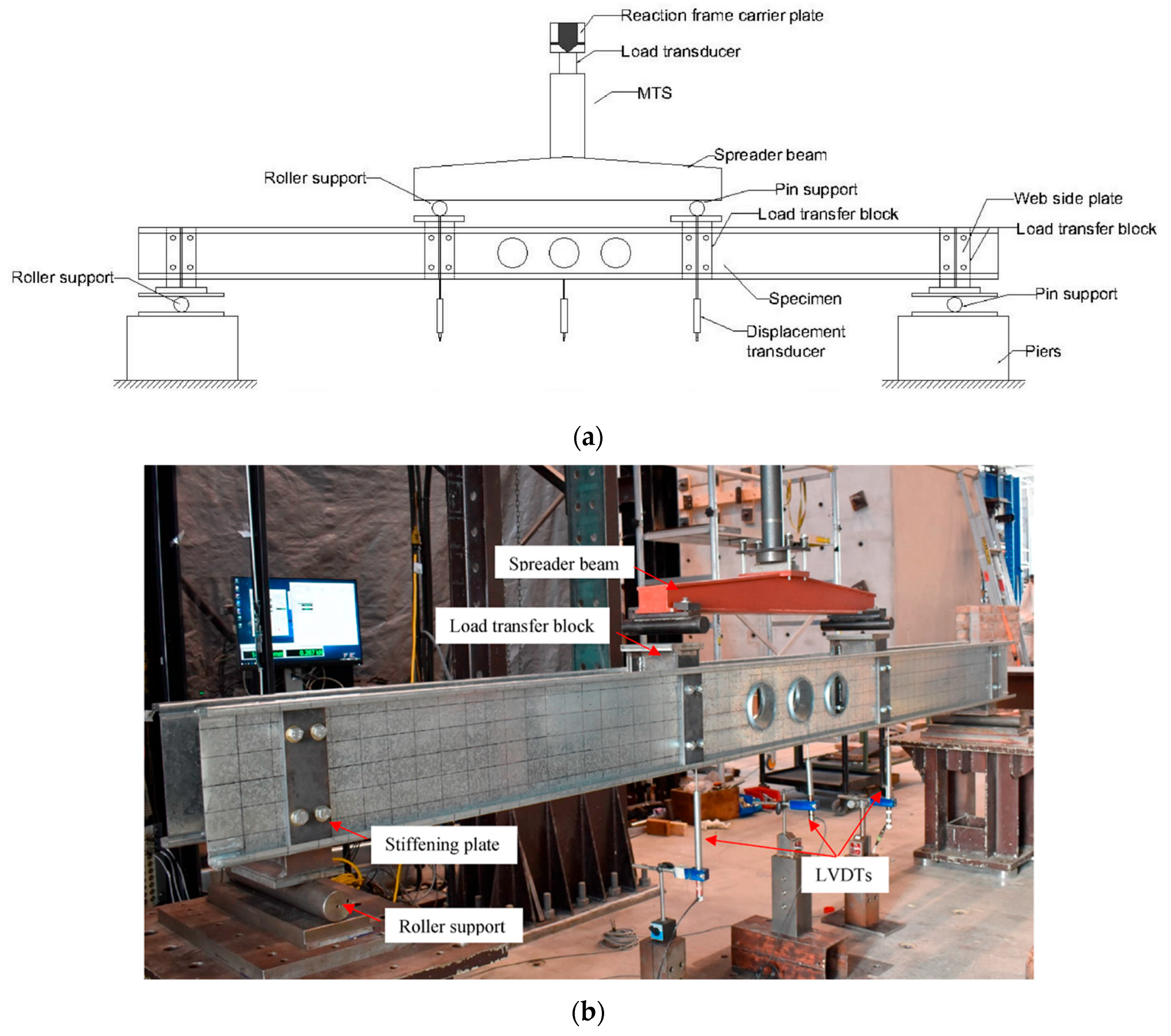 - Kanthasamy, E.; Thirunavukkarasu, K.; Poologanathan, K.; Gatheeshgar, P.; Todhunter, S.; Suntharalingam, T.; Ishqy, M.F.M. Shear behaviour of doubly symmetric rectangular hollow flange beam with circular edge-stiffened openings. Eng. Struct. 2022, 250, 113366. [Google Scholar] [CrossRef]