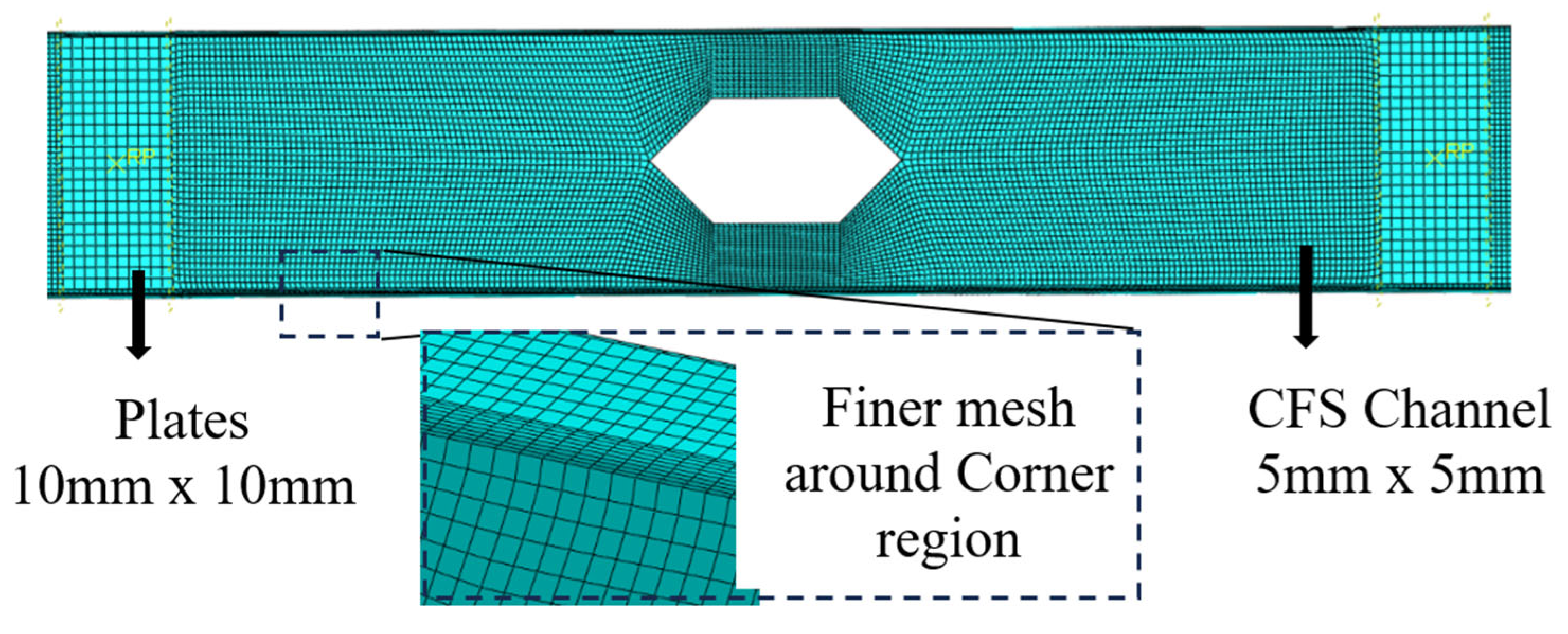 - Haidarali, M.R.; Nethercot, D.A. Finite element modelling of cold-formed steel beams under local buckling or combined local/distortional buckling. Thin-Walled Struct. 2011, 49, 1554–1562. [Google Scholar] [CrossRef]