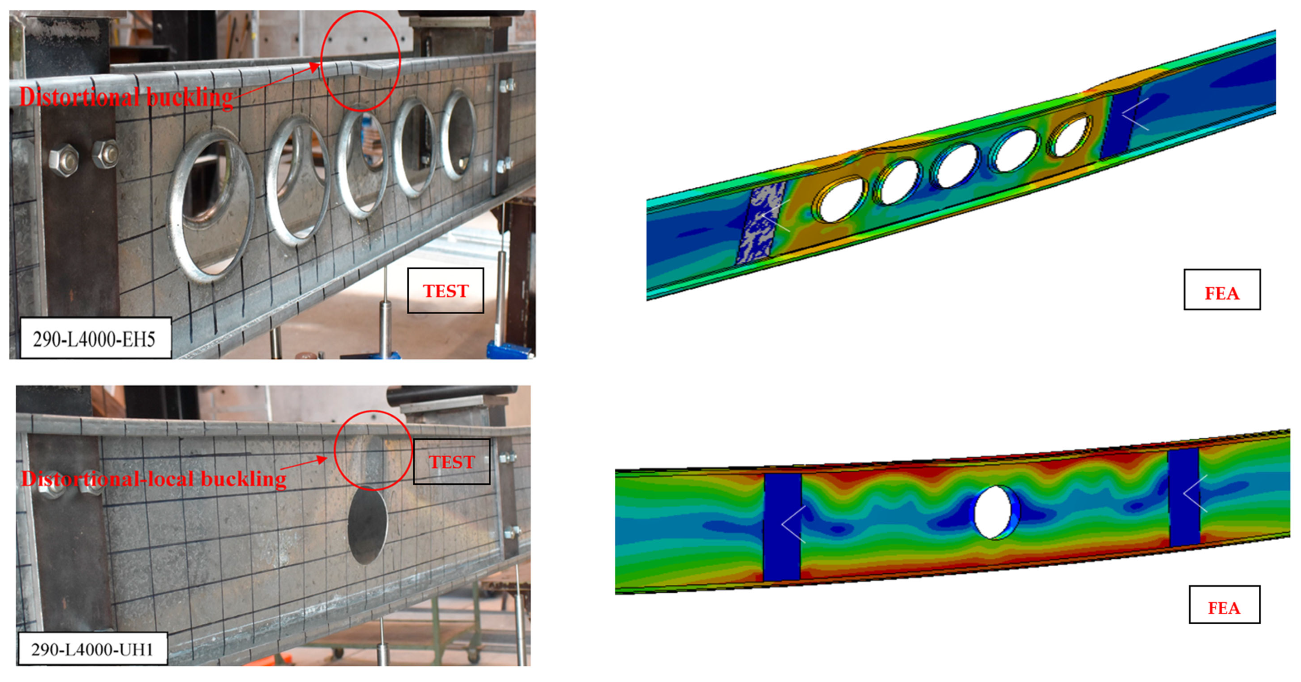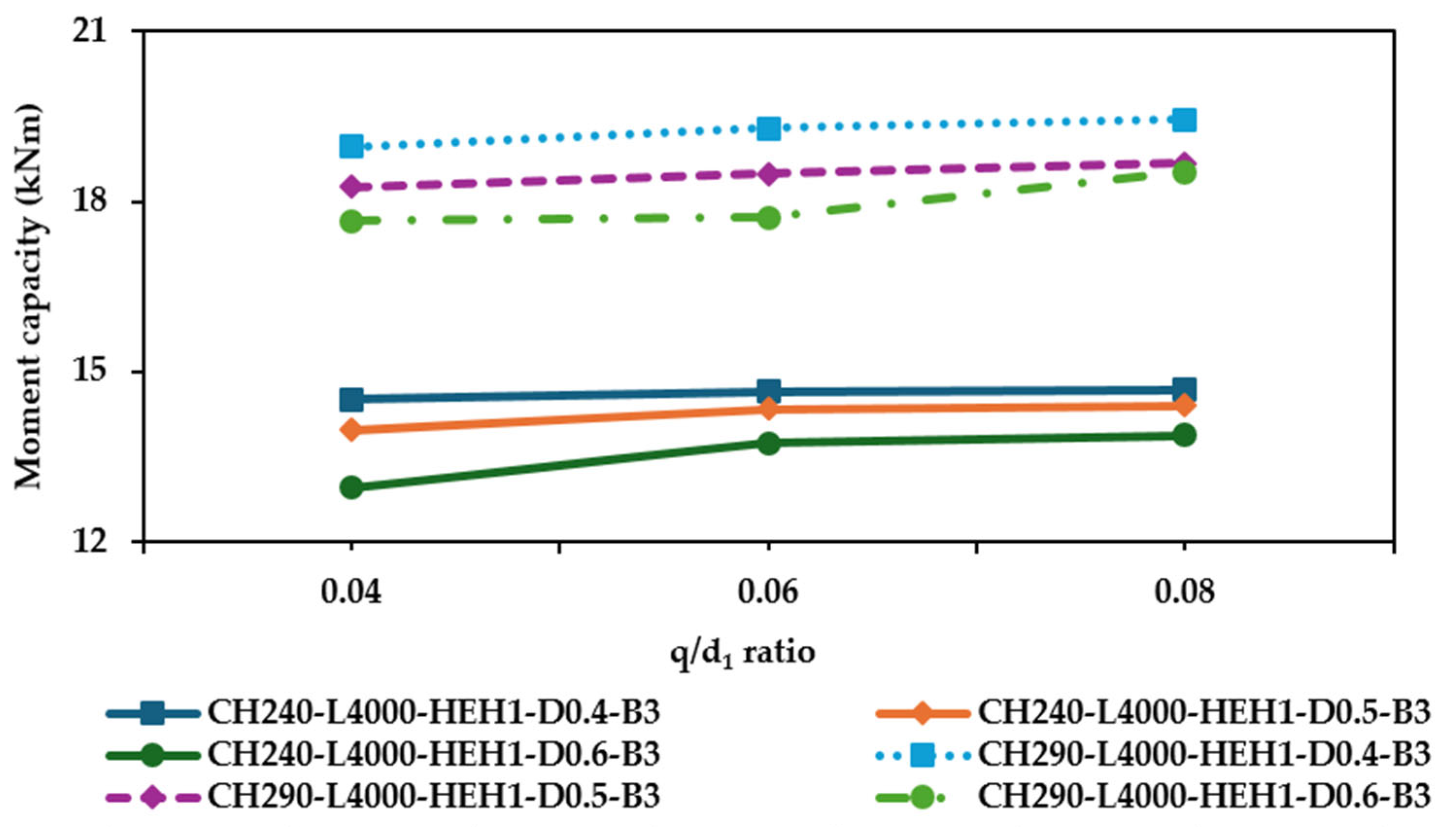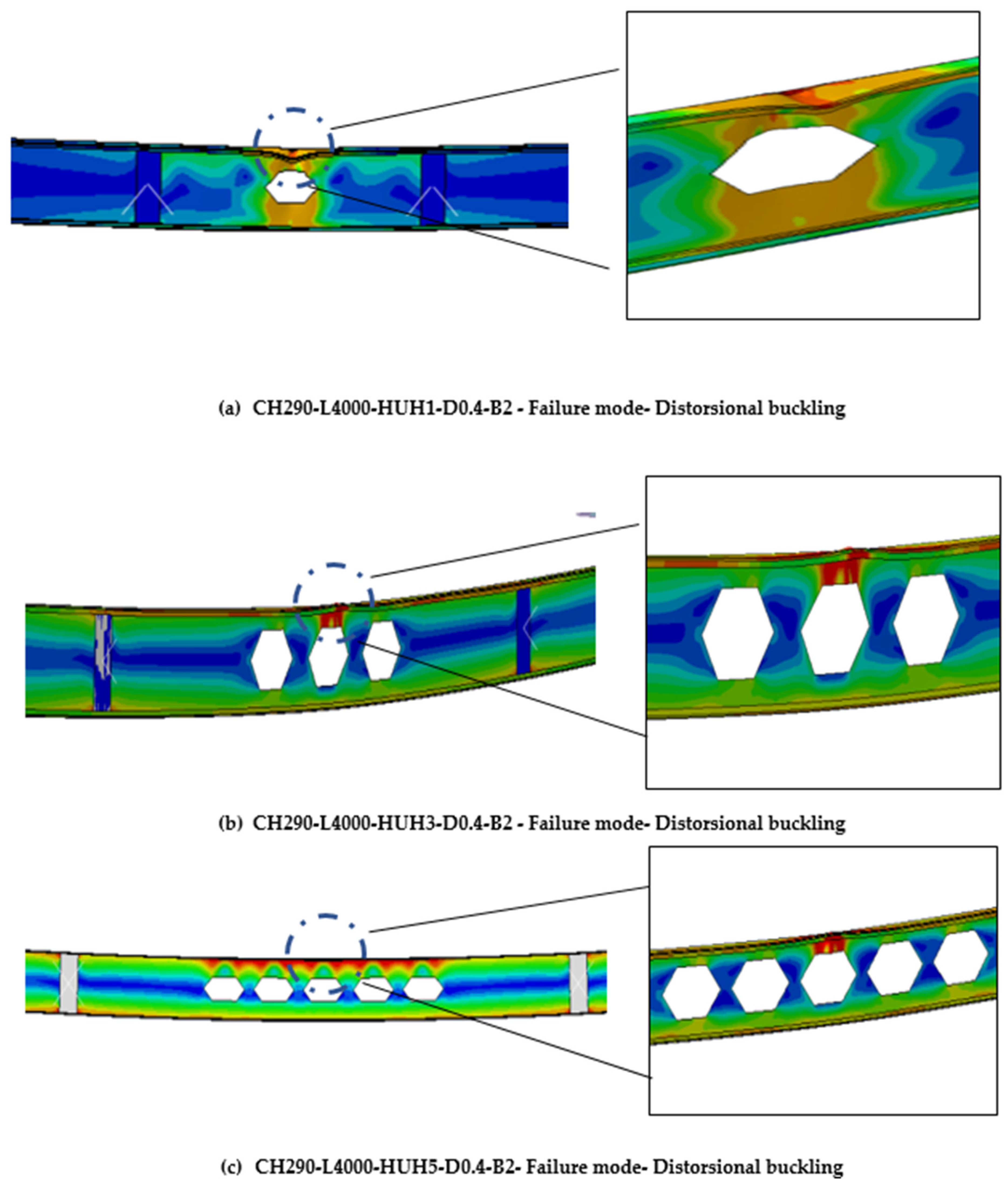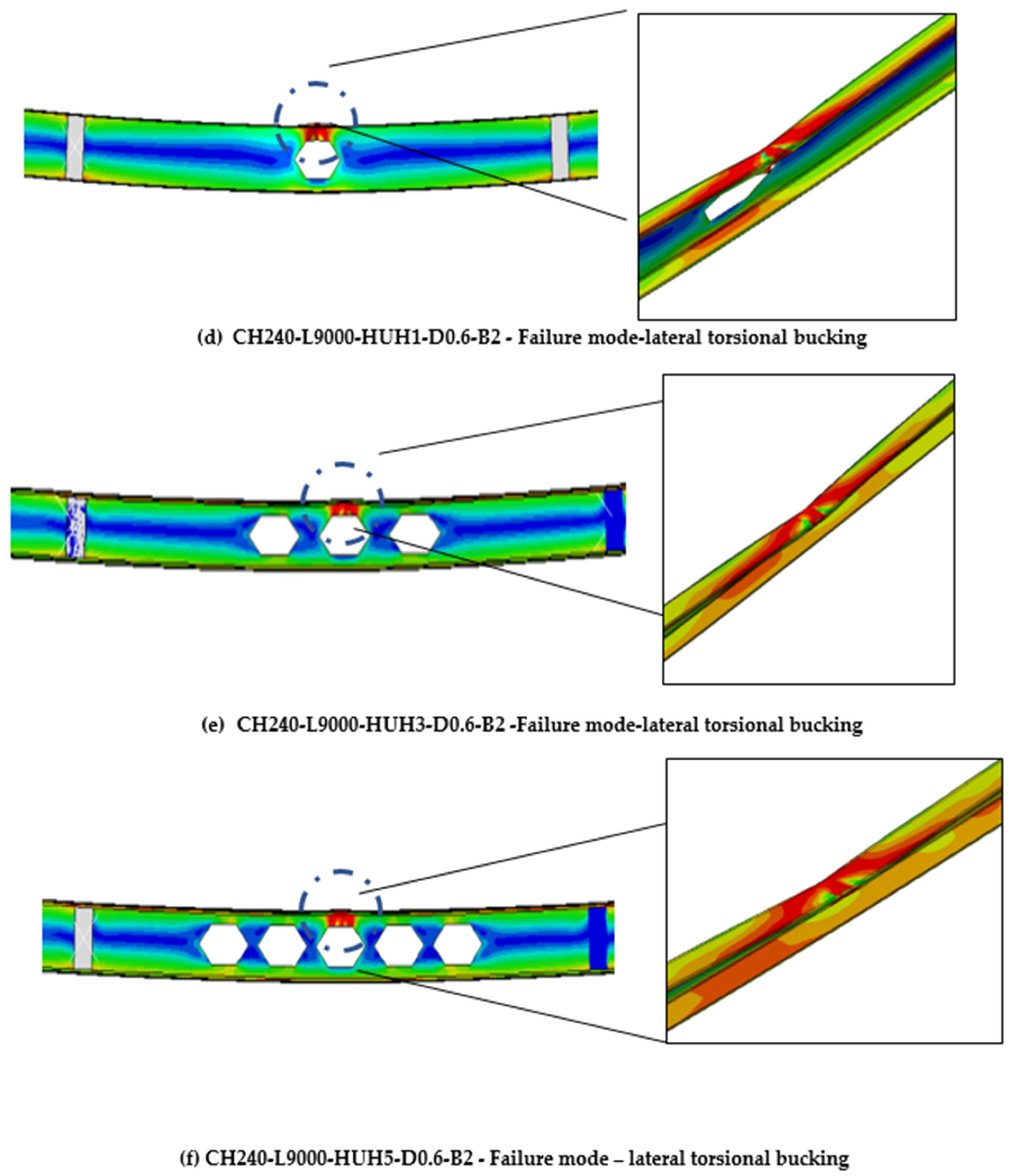- Enhanced flexural capacity through edge stiffening: The finite element simulations showed that HCFSBs with HEH configurations exhibited, on average, a 10% higher bending capacity compared to those with HUH. Among the parameters analysed, factors such as dw/d1, section depth (d), and beam span (L) significantly influenced the flexural strength, whereas the web hole radius ratio (Rq) had minimal effect.