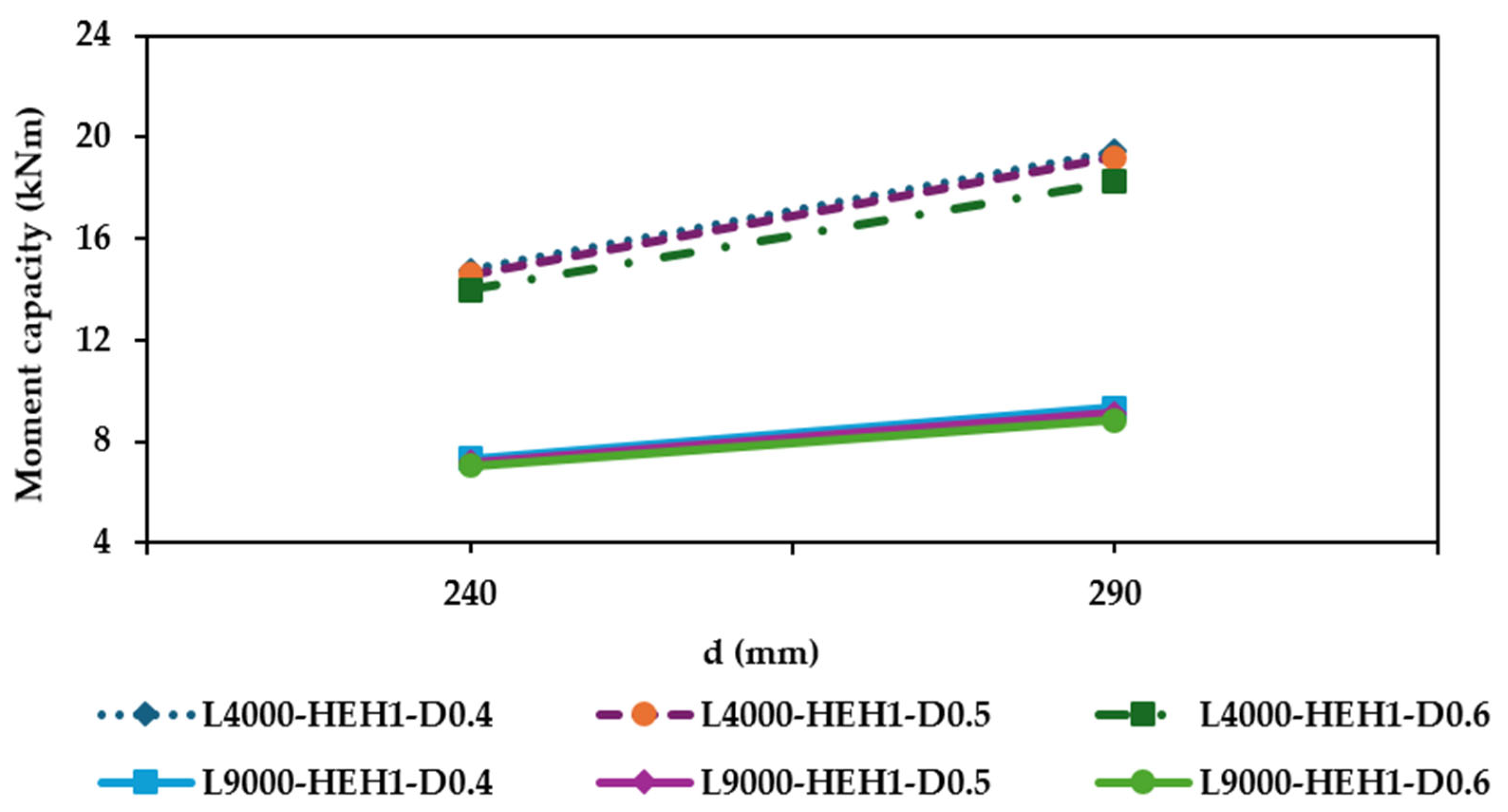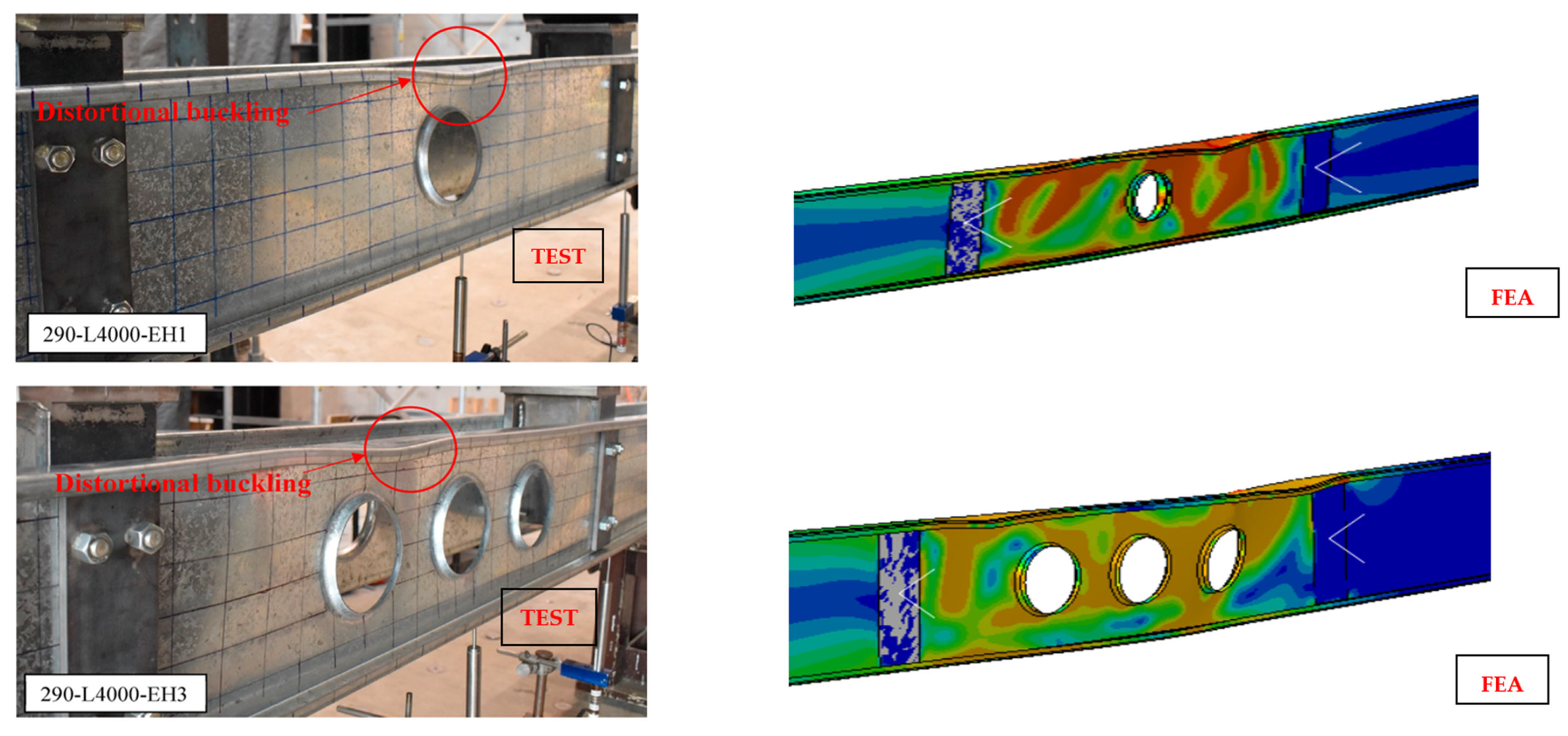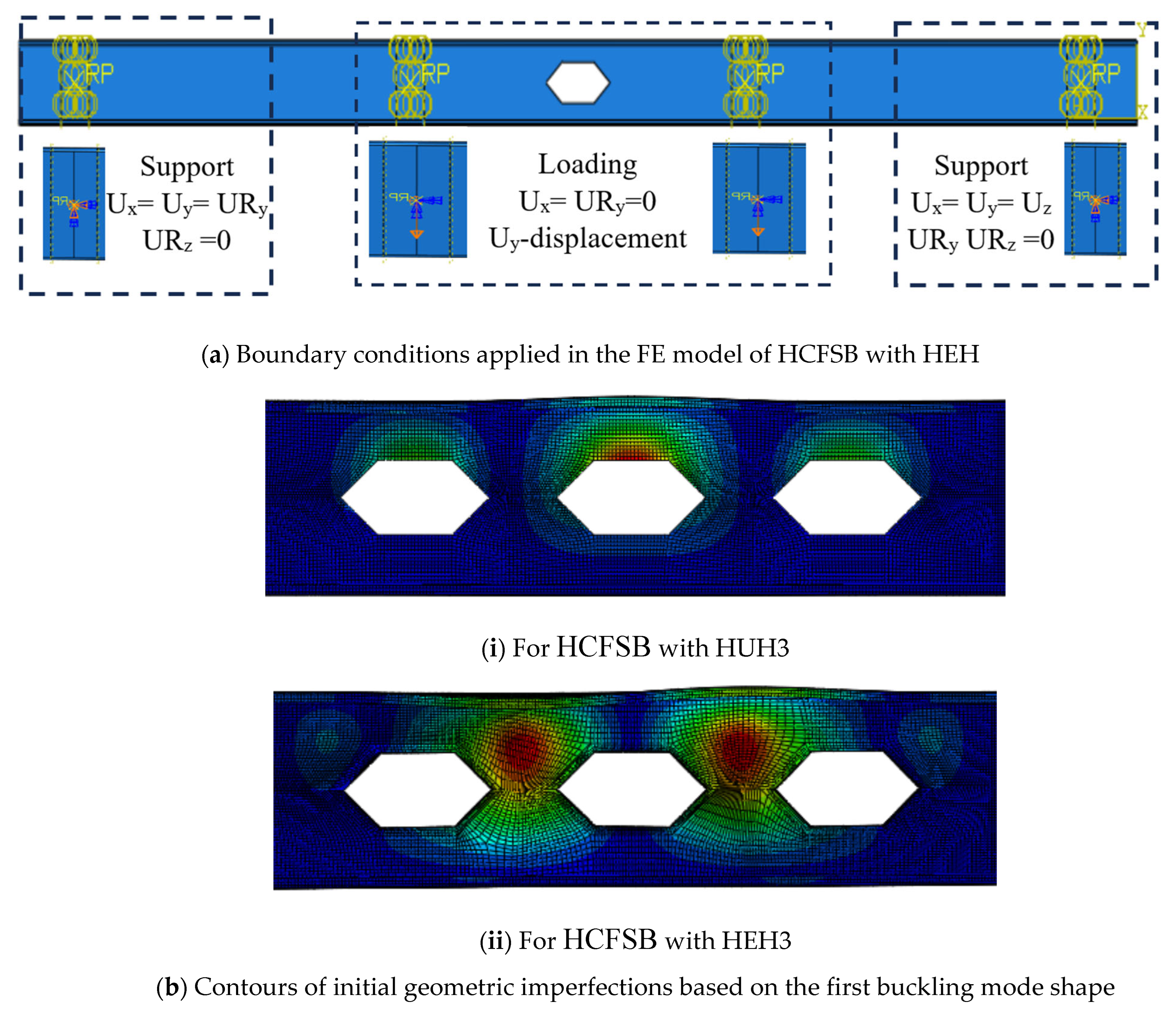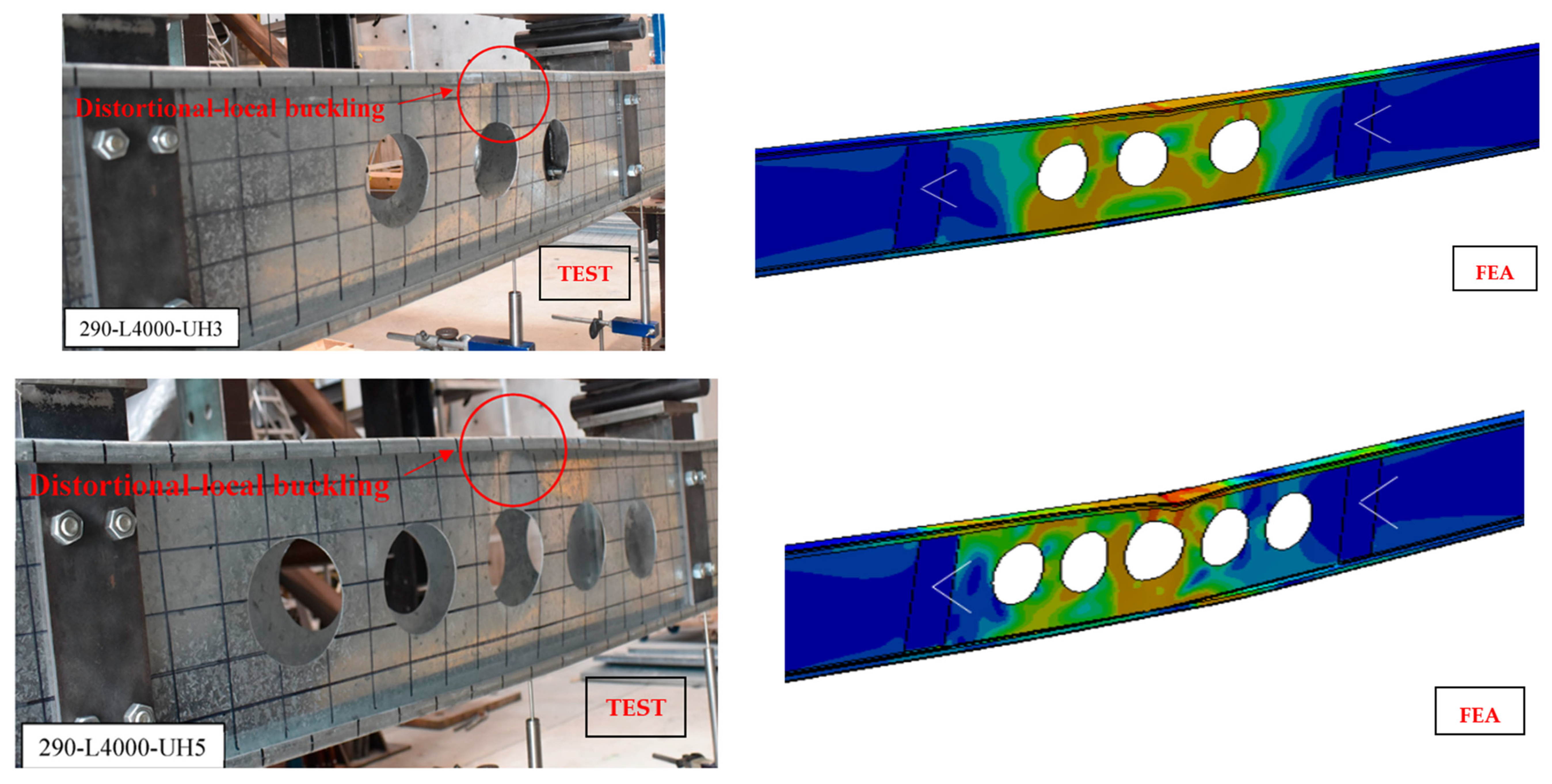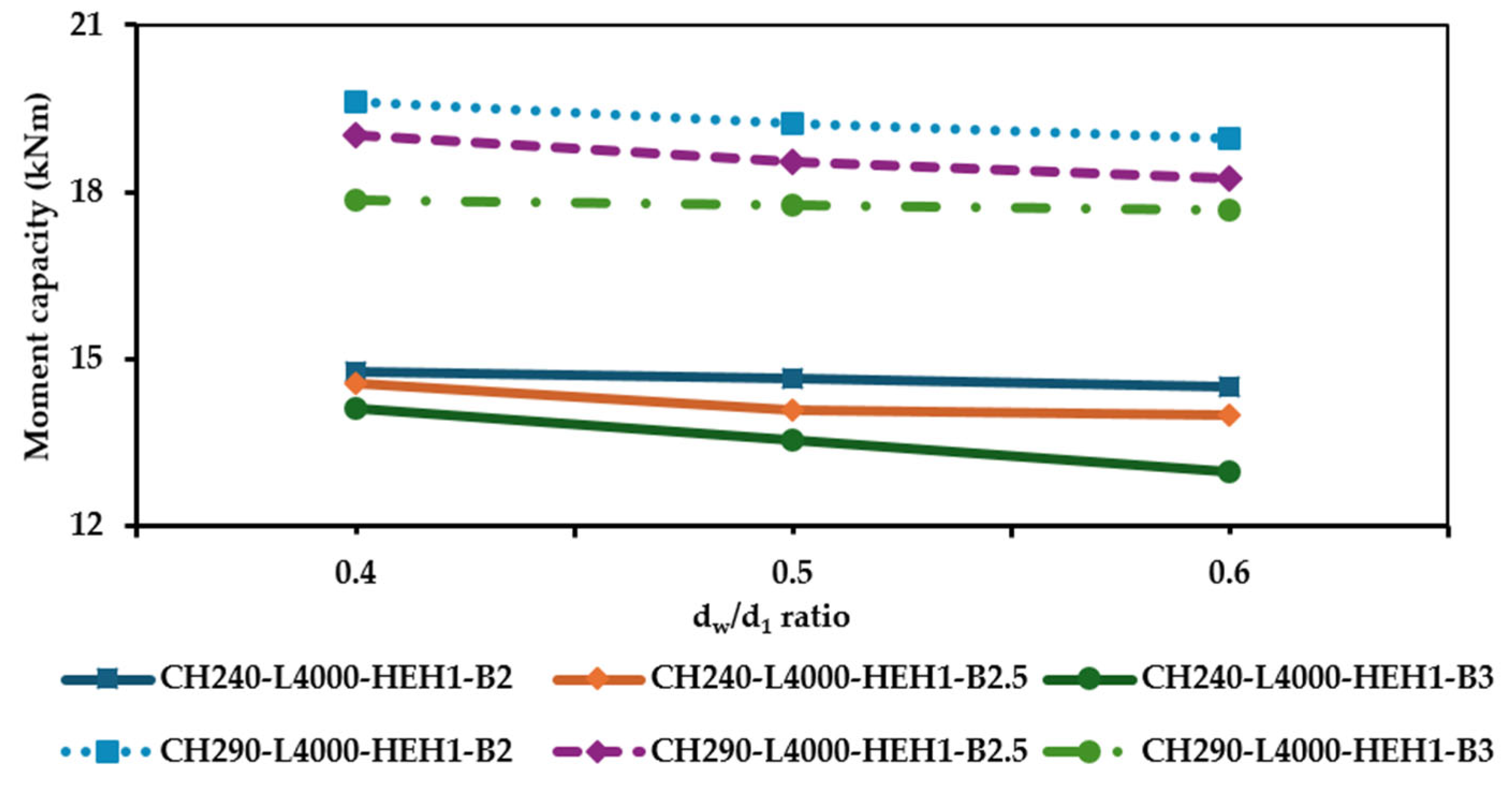 - Enhanced flexural capacity through edge stiffening: The finite element simulations showed that HCFSBs with HEH configurations exhibited, on average, a 10% higher bending capacity compared to those with HUH. Among the parameters analysed, factors such as dw/d1, section depth (d), and beam span (L) significantly influenced the flexural strength, whereas the web hole radius ratio (Rq) had minimal effect.