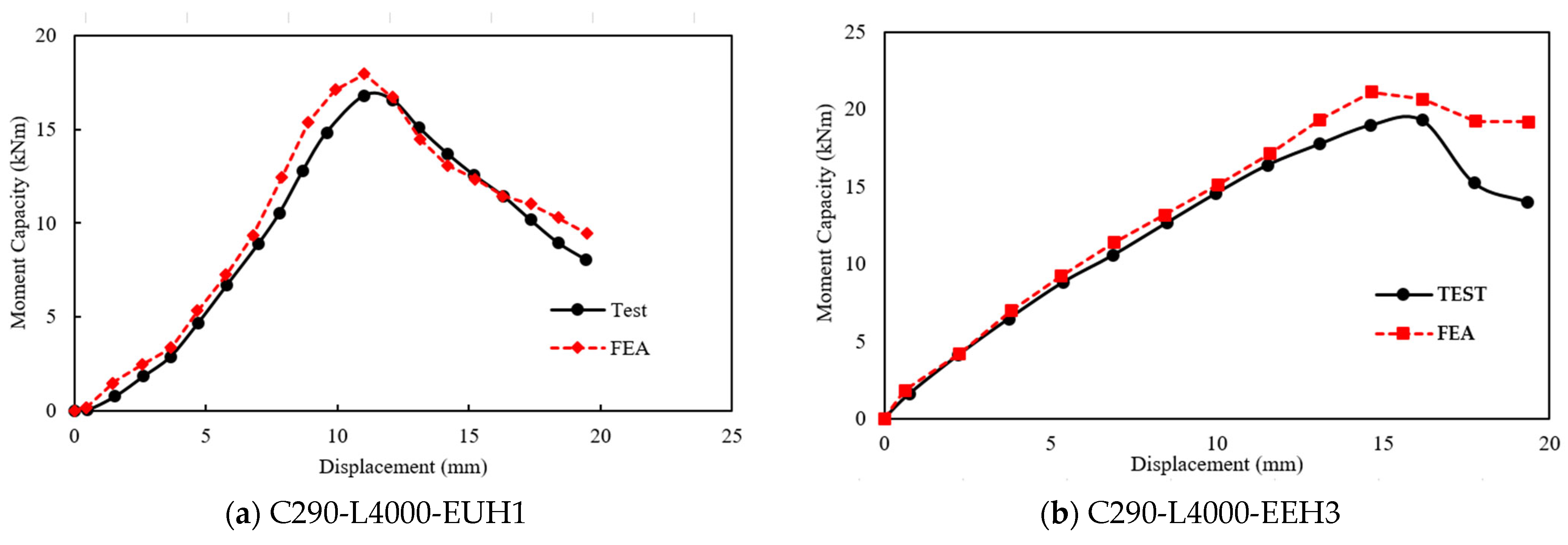 - Identified shortcomings of current DSM design provisions: A comparative analysis revealed that the current DSM-based design provisions significantly underestimate the bending strength of HCFSBs with HUH sections. The predicted capacities were found to be 23% and 47% lower than FEA results for distortional and lateral–torsional buckling cases, respectively.