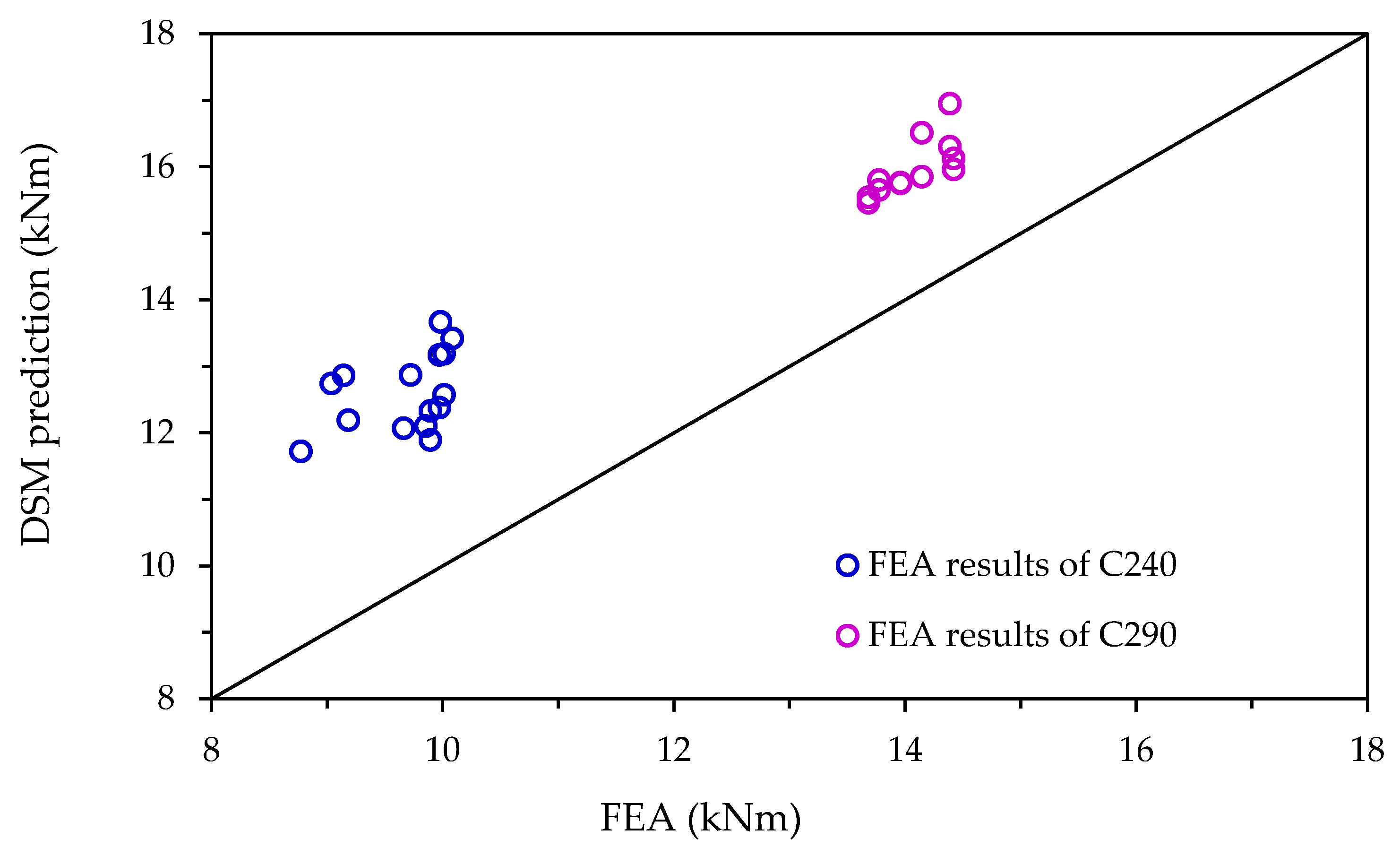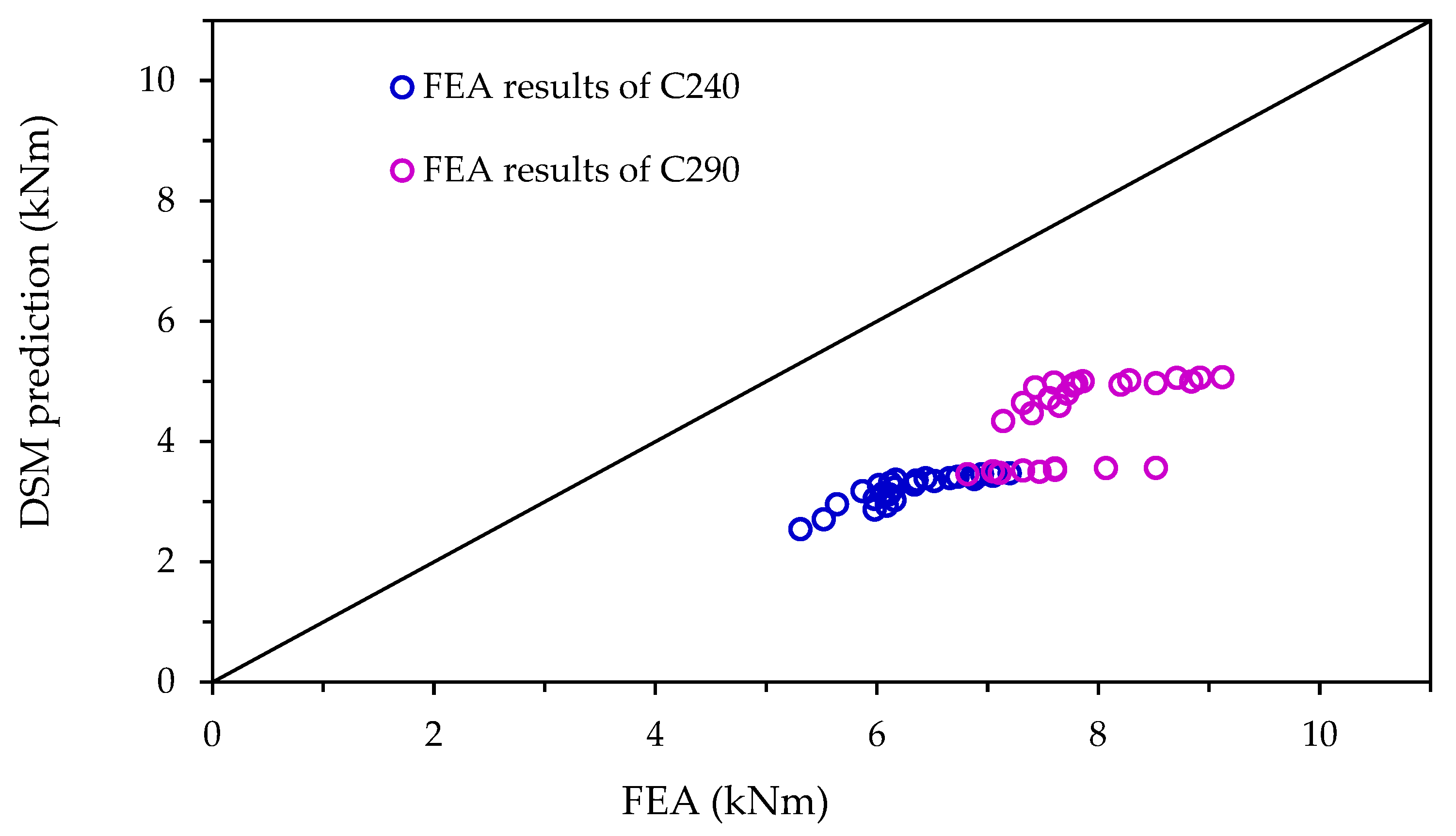 - Yu, N.T.; Kim, B.; Yuan, W.B.; Li, L.Y.; Yu, F. An analytical solution of distortional buckling resistance of cold-formed steel channel-section beams with web openings. Thin-Walled Struct. 2019, 135, 446–452. [Google Scholar] [CrossRef]