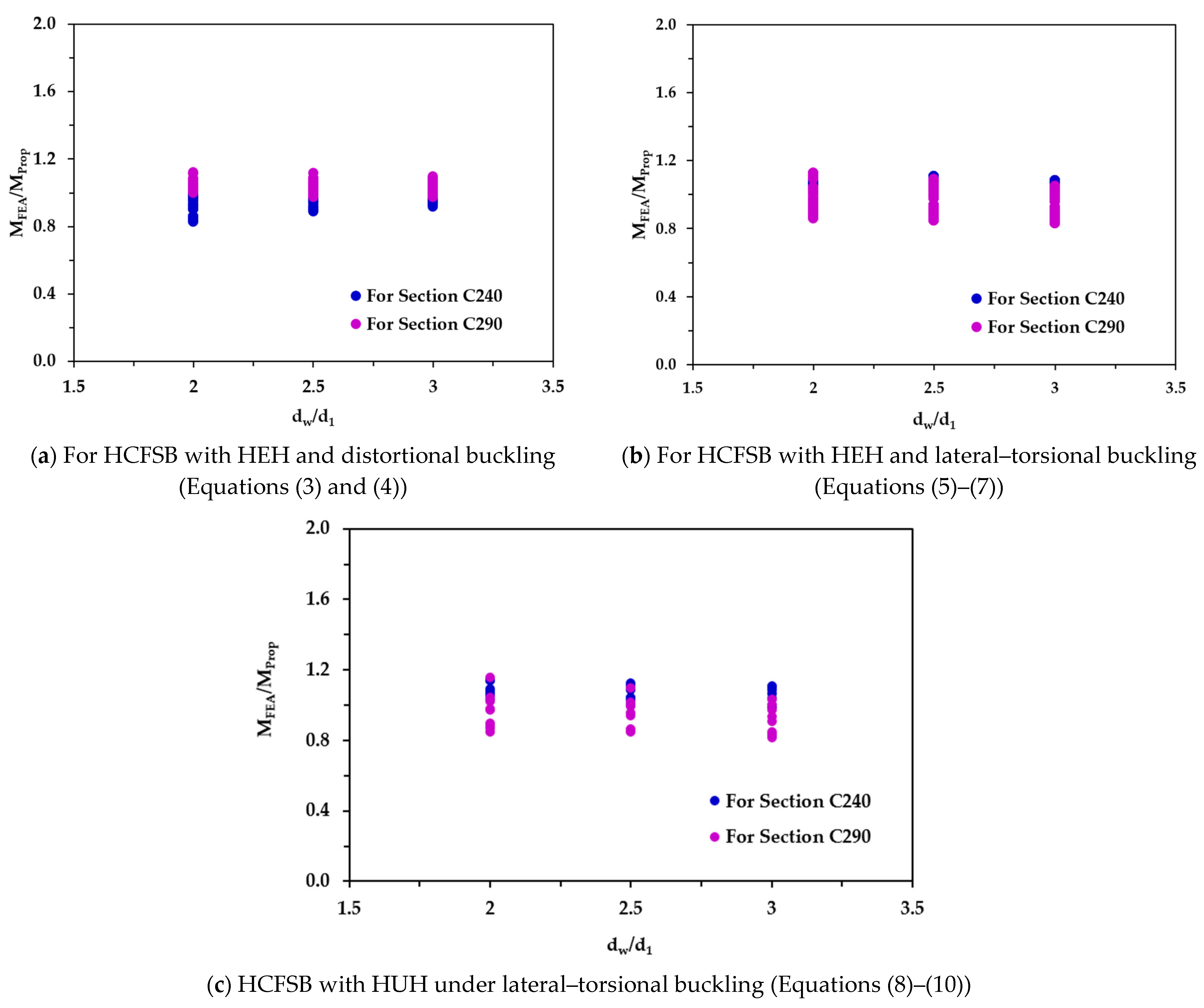 - Development of modified DSM design equations: Utilizing FEA data, new DSM-oriented expressions were developed for estimating the moment resistance of HCFSBs with both HUH and HEH web hole configurations. These equations are valid for beams having the following ranges: (1) 240 mm≤ d ≤ 290 mm, (2) 0.4≤ dw/d1 ≤ 0.6, (3) 2.00 ≤ bw/dw ≤ 3.00, (4) 0.04 ≤ q/d1 ≤ 0.08, and (5) 4000 mm≤ L ≤ 9000 mm.