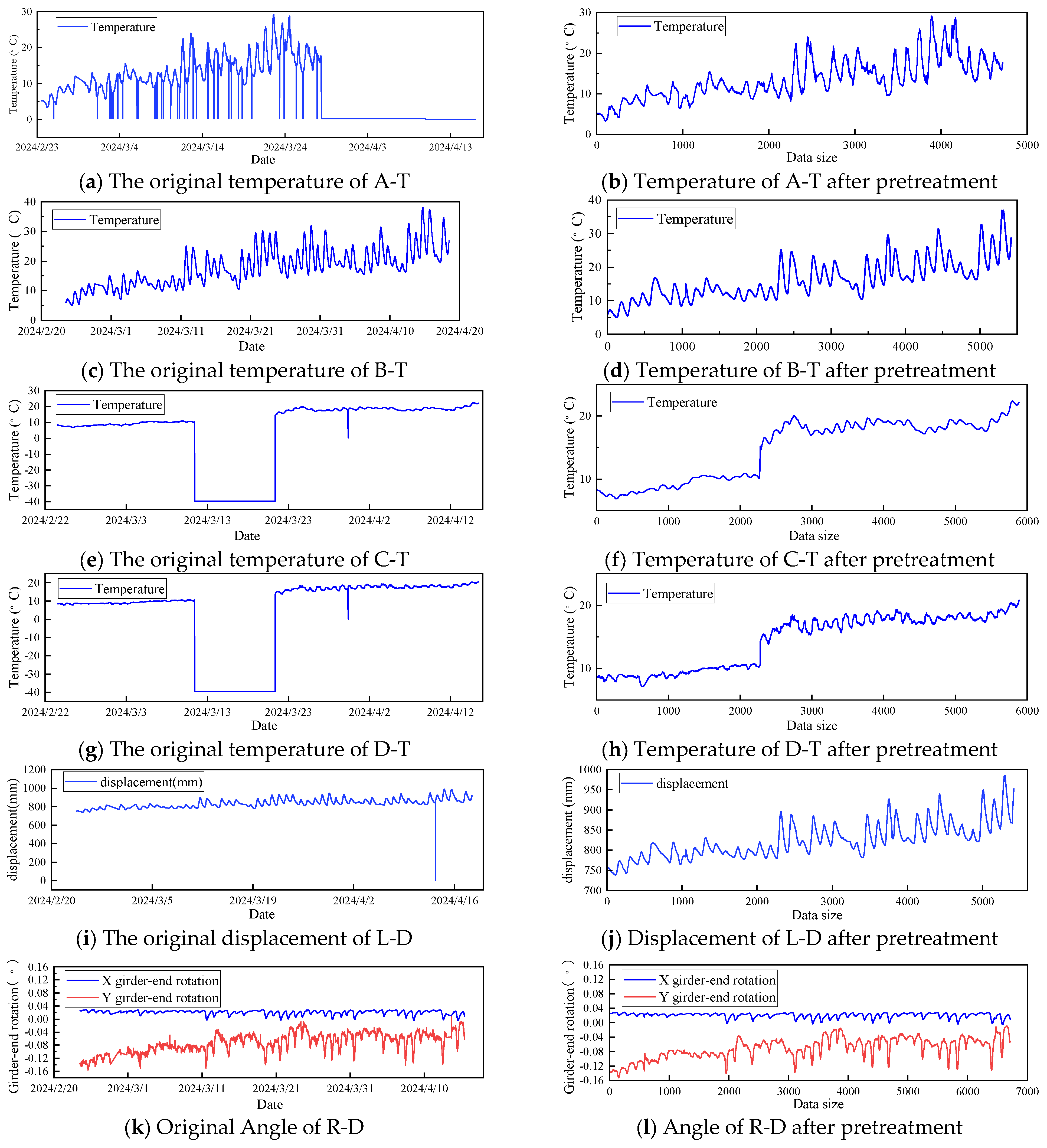 Figure 4b,d,f,h,j,l show the data obtained after preprocessing each sensor data. It can be seen that the outliers and missing values significantly improve after the data is processed.