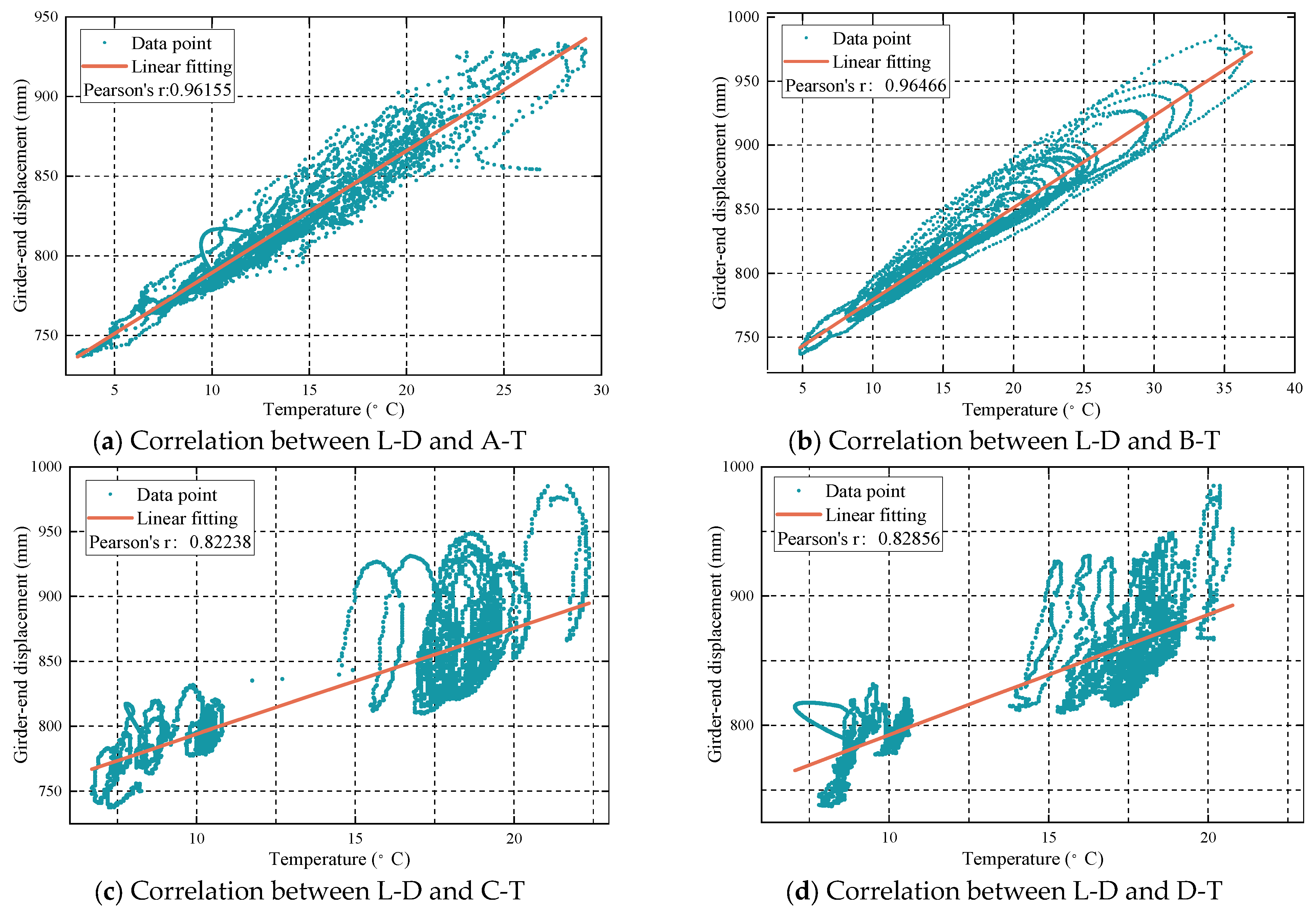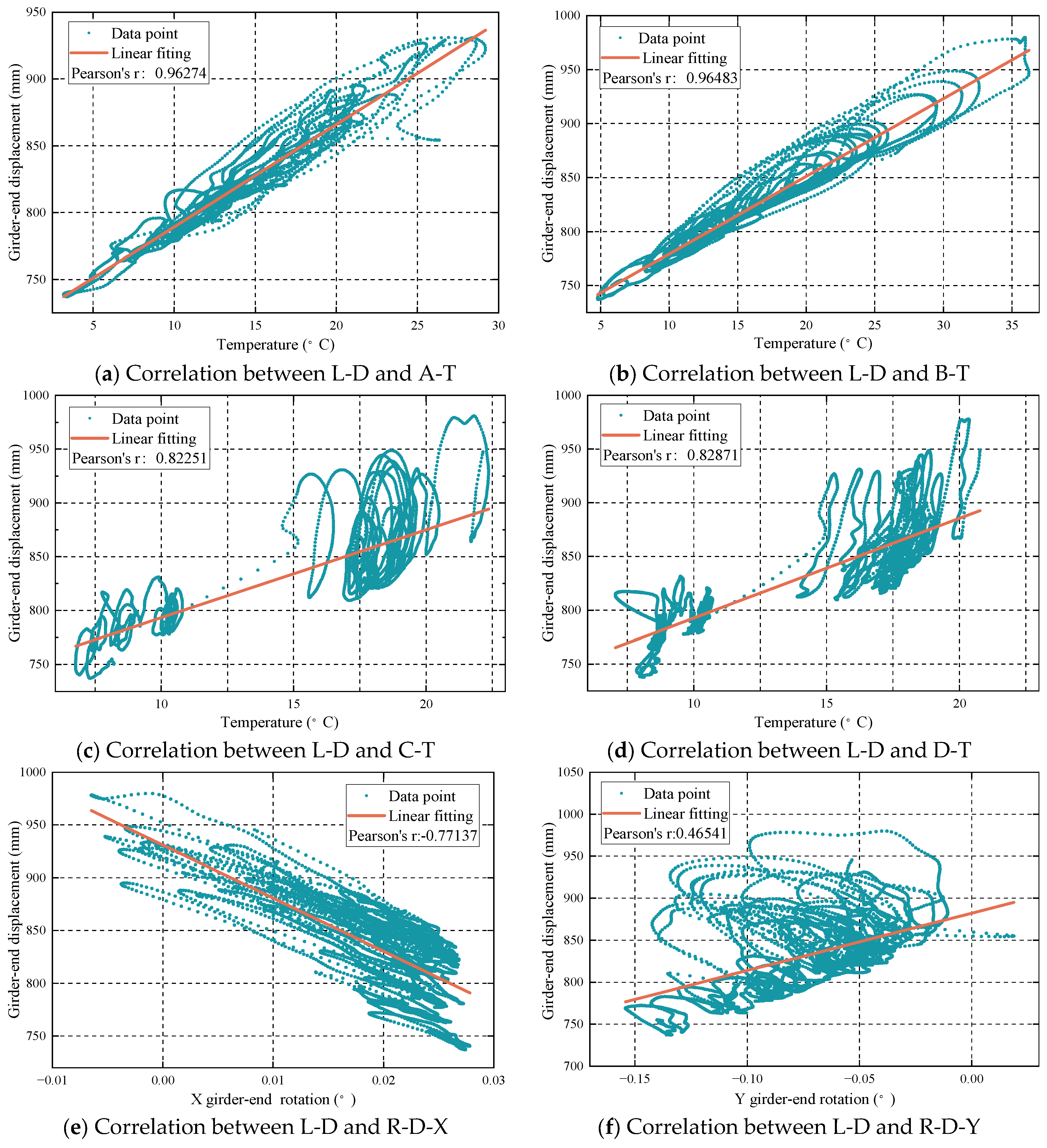 Figure 5. It can be seen from the Figure that the temperature of A-T and B-T have the best correlation with the data of L-D, and the correlation coefficient is above 0.960. Secondly, the temperature of C-T and D-T correlates well with the data of L-D, and the correlation coefficient is about 0.820. Finally, the data of R-D correlate well with L-D. It can be seen from the correlation that L-D decreases as the absolute value of R-D increases, which also confirms that the beam end angle in