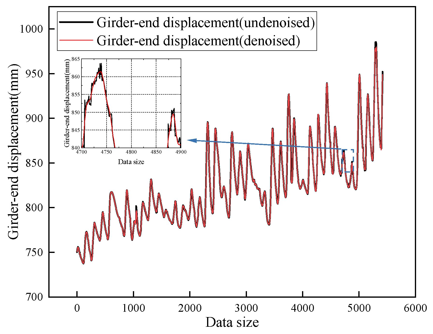 Figure 6, the displacement curve of the beam end after denoising by wavelet transform retains the change trend of the original data and becomes smooth.
