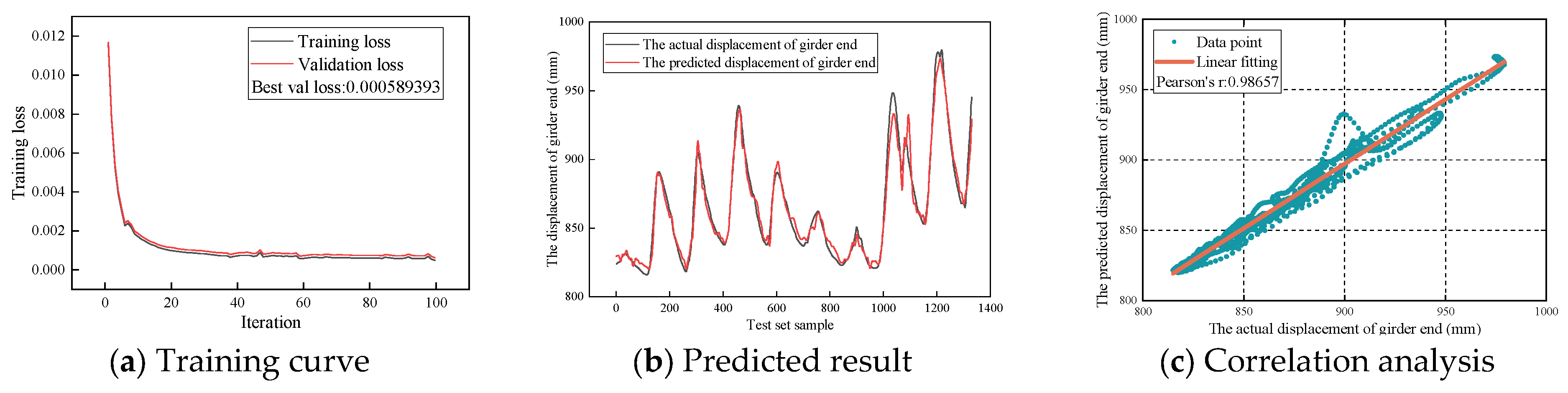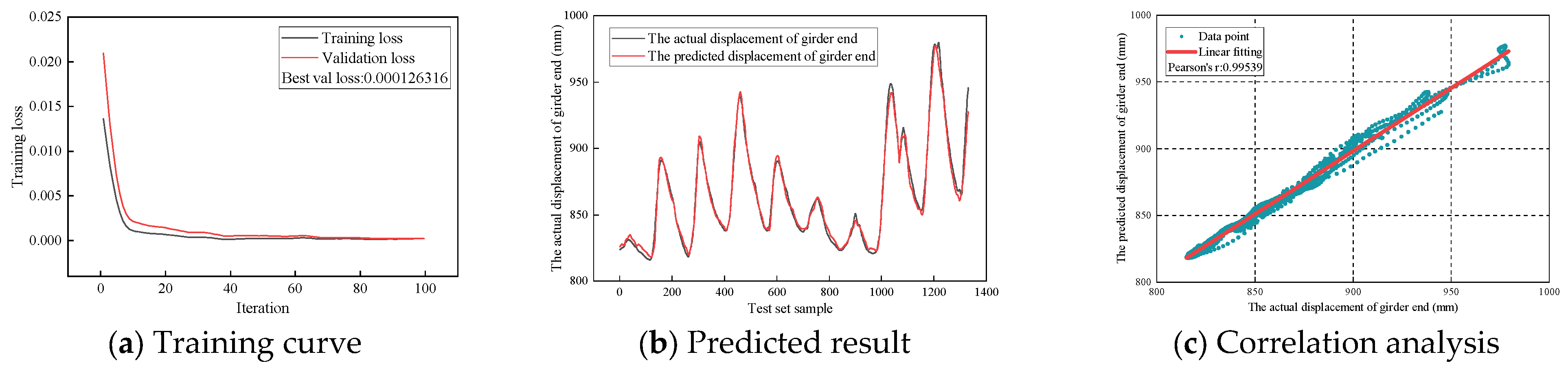 The model is set using the above hyperparameters. After 100 training iterations, the training loss curve, prediction graph, and prediction result correlation graph are obtained, as shown in
