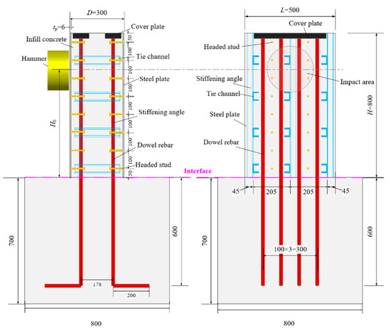 The effective connection is important for the safe service of SC structure under impact load, but limited studies have been conducted so far on the SC wall-to-foundation connections, especially for dynamic response. For the connections of SC walls and RC foundation, three typical connection types were provided in JEAG 4618-2005, namely embedding, anchor, and dowel methods [17]. Among these methods, the dowel method, also called lap splice connection [18], is commonly used in practical engineering construction due to its construction convenience. This method uses dowel rebars to extend into the foundation and insert upwards into the SC wall to transfer the force. Kurt et al. [19] performed experimental and numerical investigations on the structural performance of SC wall-to-foundation connections subjected to the in-plane cyclic lateral force. The results showed that the deformation capacity and ductility of the specimens with dowel connection were better than the SC wall specimen. Wang et al. [20] carried out experimental investigation on SC wall-to-foundation connection specimens under axial compression and cyclic lateral force. The height-to-thickness ratio of the SC wall was critical in determining the failure modes of the test specimens under out-of-plane loading. The test specimens with height-to-thickness ratios of 1.33 and 2.5 showed the shear and flexure-splitting failure modes, respectively.