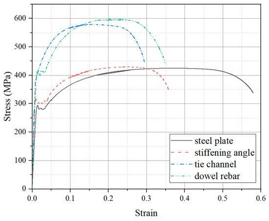 Three test specimens were fabricated for the impact tests, each consisting of the SC wall and the RC foundation, with the layouts depicted in Figure 2. The dimensions of all the fabricated specimens were identical. The SC wall dimensions were 300 mm in thickness (D), 500 mm in width (L), and 800 mm in height (H). It is worth noting that the out-of-plane performance of the SC wall is independent of its length and mainly depends on the height-to-thickness ratio [24,25]. Additionally, the length of the SC wall used in this paper was conducive to applying more uniform out-of-plane impact loads to obtain more accurate test results. The SC wall specimens with a similar height-to-thickness ratio have also been investigated in previous studies [20,26]. The investigated parameters included the impact energy and the concrete strength grades of the SC wall. For the SC wall, two steel plates with 6 mm thickness (ts) were welded by stiffening angles and tie channels. The stiffening angle is specified as the hot-rolled unequal-leg angle ∟50 × 32 × 4. The long legs of these angles were welded to the inner face of the steel plates, with a length of 800 mm, consistent with the height of the SC wall. Tie channels, designated as hot-rolled light channel C5, were welded at both ends to the stiffening angles with approximately 200 mm spacing. Headed studs, 10 mm in diameter and 100 mm in length, were welded onto the inner face of the steel plates, spaced at intervals of 100 mm along the wall height and 200 mm along the width. For connecting the RC foundation and the SC wall, eight dowel rebars with a diameter of 20 mm were utilized. The selection of the number and diameter of dowels was based on Ref. [20] and reinforcement ratio demand. The RC foundation measured 800 mm in length, 800 mm in width, and 700 mm in height, reinforced with HRB400 rebars of 20 mm diameter. Furthermore, as presented in Table 1, according to the GB/T228.1-2010 [27] and GB50081-2002 [28], the material properties of each steel component and concrete were determined through standard tensile coupon tests and uniaxial compressive loading tests, respectively. The stress–strain curves of different steel components were shown in Figure 3.