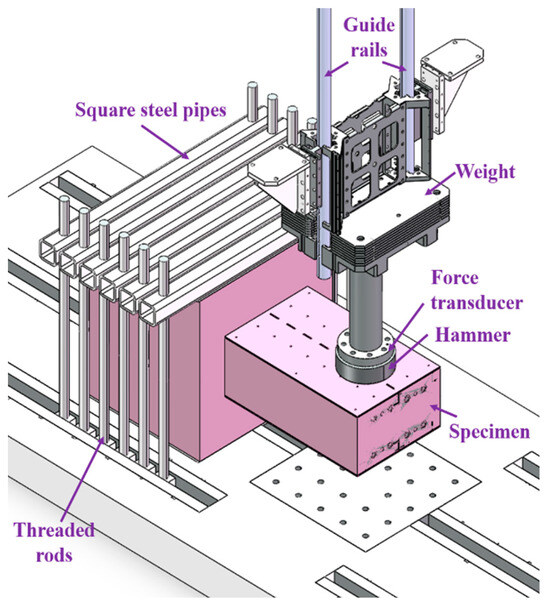 The impact experiments were carried out using an instrumented drop weight impact machine, as illustrated in Figure 4. The cylindrical rigid hammer diameter was 256 mm, and the mass of the hammer was 235 kg with 12 alterable additional weights (each 65 kg). A computer system was used to raise the hammer to the required impact height (Hh), and the maximum value can be set to 16 m. In order to fix the RC foundation on the laboratory floor, square steel pipes and threaded rods were used.
