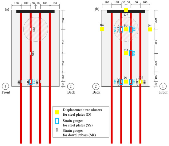 Instrumentation layouts of the specimens: (a) measuring points of top steel plate and dowel rebars; (b) measuring points of bottom steel plate and dowel rebars.