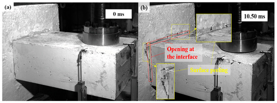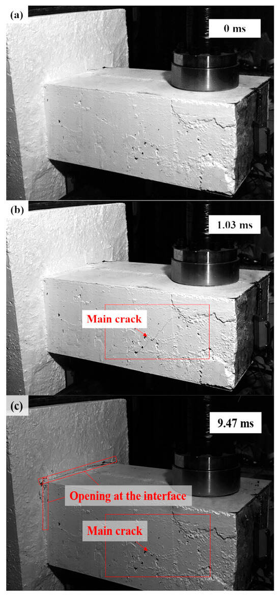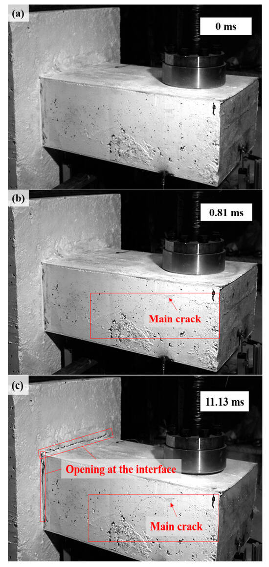 As shown in Figure 6 and Figure 7, the damage evolution process of two specimens, H2-C30-L1 and H2-C50-L2, showed a similar trend. The main crack was observed near the hammer on the SC wall within 1.1 ms of contact between the hammer and the SC wall (see Figure 6b and Figure 7b). Subsequently, the upper steel plate and the RC foundation separated, resulting in the interface opening, and it was obvious that the opening in specimen H2-C50-L2 was more pronounced than that in specimen H2-C30-L2 (see Figure 6c and Figure 7c). However, it was noteworthy that the main crack did not demonstrate significant expansion during the impact process. For specimen H2-C50-L1, as seen in Figure 8, a similar interface opening was also observed, but there was no evident damage (e.g., concrete cracks or concrete spalling) on the SC wall. It was also important to note that, in contrast to specimens H2-C30-L1 and H2-C50-L2, apparent surface peeling was observed on the concrete of specimen H2-C50-L1 at the upper and left edges of the interface (see Figure 8b). This might be attributed to the brittleness of C50 concrete being more pronounced than that of C30 concrete as the impact energy increased.