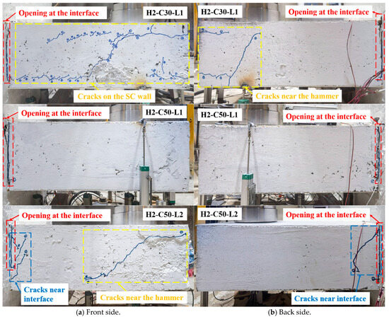 On the front side, the interfacial cracking length of specimens H2-C30-L1 and H2-C50-L1 was approximately 9/10 of the wall height, while the interfacial cracking length of H2-C50-L2 was around 2/3 of that (see Figure 9a). As for the back side, the interfacial cracking length of all test specimens was about 9/10 of the wall height (see Figure 9b). The measured maximum crack widths on the left, upper, and right sides of the interface are presented in Table 3. The maximum crack widths on three sides of specimen H2-C30-L1 were the largest among the three specimens; the Cl, Cu, and Cr of H2-C30-L1 were 2.90 mm, 4.46 mm, and 8.75 mm, respectively. Additionally, there were two horizontal splitting cracks that connected the headed studs observed on the front side of the SC wall concrete of specimen H2-C30-L1 (see Figure 9a) and characterized by the flexural failure. In previous studies, similar splitting cracks were also reported [20,29].