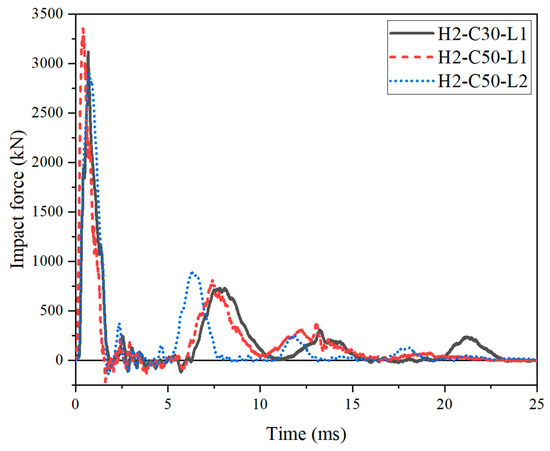 The impact force–time histories of the SC wall-to-foundation connections were compared in Figure 10. All curves were similar, showed a sharp rise to their peak then rapidly dropped to zero at first, which looked like a slim triangle, followed by a series of intense and dense fluctuation. Then, a squat triangle was observed, and after that, there were some slight fluctuations.
