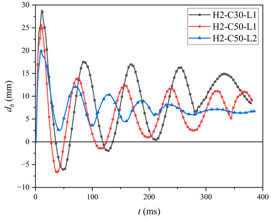 As shown in Figure 11, compared to specimens with a concrete strength grade of C50, the specimen with a concrete strength grade of C30 had a longer free vibration period and larger amplitude. However, the db,max and dbrof H2-C30-L1 were larger than those of H2-C50-L1: 12.3% and 26.3%, respectively. With the same concrete strength grade of C50, compared to specimen H2-C30-L1, specimen H2-C50-L2, which was subjected to lower impact energy, exhibited a shorter free vibration period as well as smaller amplitude, and faster reached the stable value (6.40 mm), named residual deflection. In addition, the db,max and dbr, respectively, decreased by 28.8% and 30.6% as the impact energy decreased from 14.7 kJ to 9.8 kJ.