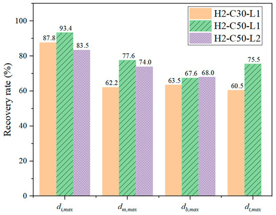 Q values of di,max, dm,max, db,max, and dt,max of H2-C30-L1 were 87.8%, 62.2%, 63.5%, and 60.5%, respectively, whereas those of H2-C50-L1 were 93.4%, 77.6%, 67.6%, and 75.5%, respectively. For specimen H2-C50-L2, Q values of di,max, dm,max, and db,max were 83.5%, 74.0%, and 68.0%, respectively.