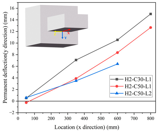 The distribution of permanent deflection on the bottom steel plate is shown in Figure 13. The deformed shapes of all test specimens presented an approximately linear shape along the x direction of the SC wall (800 mm), indicating the flexural failure mode. Generally, the permanent deflection values of H2-C30-L1 were larger than those of H2-C50-L1, while those of specimens H2-C50-L1 and H2-C50-L2 were relatively close. This indicated that the influence of concrete strength on permanent deflection was more significant than that of impact energy.